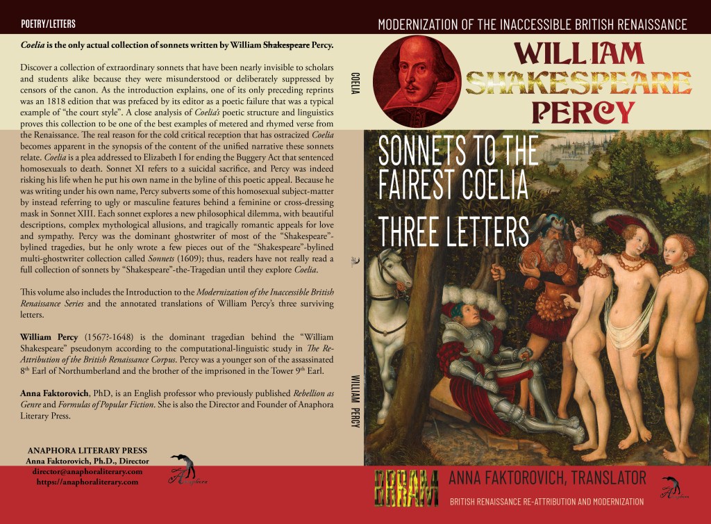 “Historians have long recognized that the revered Hippocratic Corpus is an accretion of the writings of many ghost writers and imitators. The analysis of a similar process of accretion in the instance of the British Renaissance Corpus has brought to the fore contributors and ghostwriters here-to-fore largely unknown. Such is the case with William Percy, obscure poet of the 17th century./ At first glance, the notion that careful analysis of this phenomenon may be assisted by artificial intelligence seems contrary to humanistic literary values. But Anna Faktorovich has been a full and sensitive participant in the process and the result is not only her computational-linguistics re-attribution, but also a sensitive, accessible rendition of William Percy’s twenty Sonnets to Coelia./ The poems are contextualized by exordia from multiple historical authors and perspicaciously by Anna Faktorovich herself. Such contextual writings illuminate the central purpose of Percy’s poetizing; the Sonnets to Coelia are an apologia for alternative forms of human love, more specifically an apologia for homosexual love. It is, therefore, of considerable modern interest as an important milestone (or millstone) in the historical record of laws governing human sexuality. Sonnets to Coelia is a plea to Elizabeth I to reverse the ‘Buggery Act’ of 1533, which she instead reinstated./ The poems themselves exemplify the period. They conform to the sonnet form with considerable consistency. What makes them seem most archaic to the modern ear is their rhyme. Commitment to rhyme over-rides all other considerations: it over-rides rhythm, it over-rides accessibility and often renders locutions awkward. Still a careful reading, aided by the abundance of footnotes, is rewarded by considerable amusement and insight./ Perhaps the greatest reward is received if the ‘beholder’s share’, that which the reader brings to the poem, is the presupposition that Coelia is a rubric signifying all the manifold and various forms of human love. Consider for example Sonnet 16 where a grain of cruelty seems to be welcomed:/ ‘Then, if I swear thy love does make me languish;/ Thou turn away, and smile scornfully./ And if I weep; my tears thou despise.’/ In summary, William Percy’s Sonnets to Coelia are a fascinating read and receive my highest recommendation.” —Midwest Book Review, Lloyd Jacobs (December 2021)