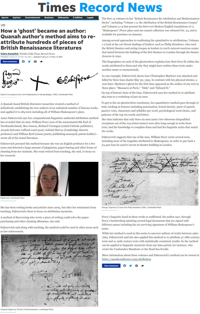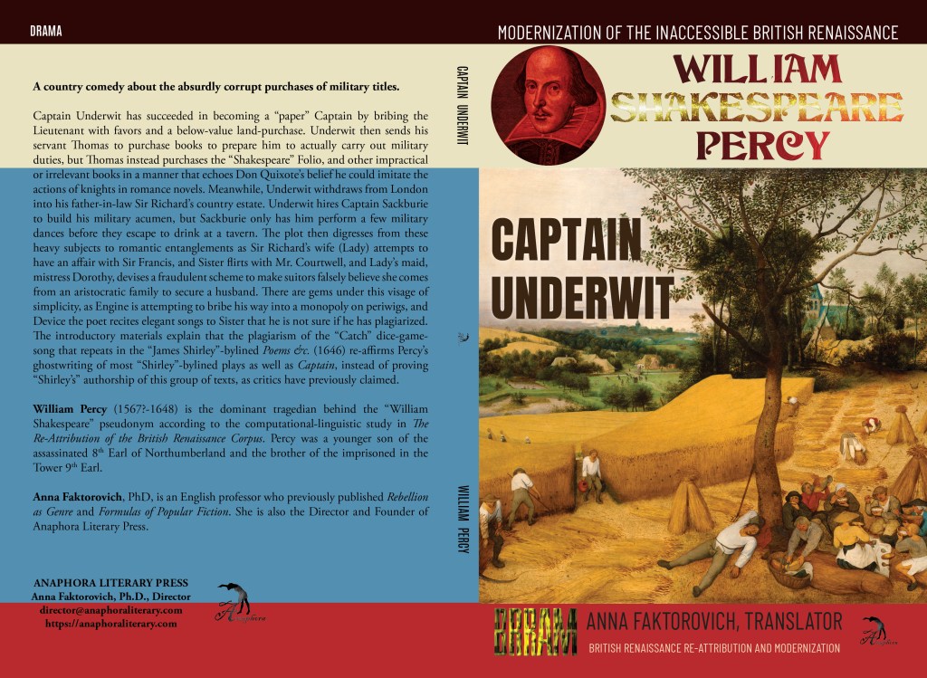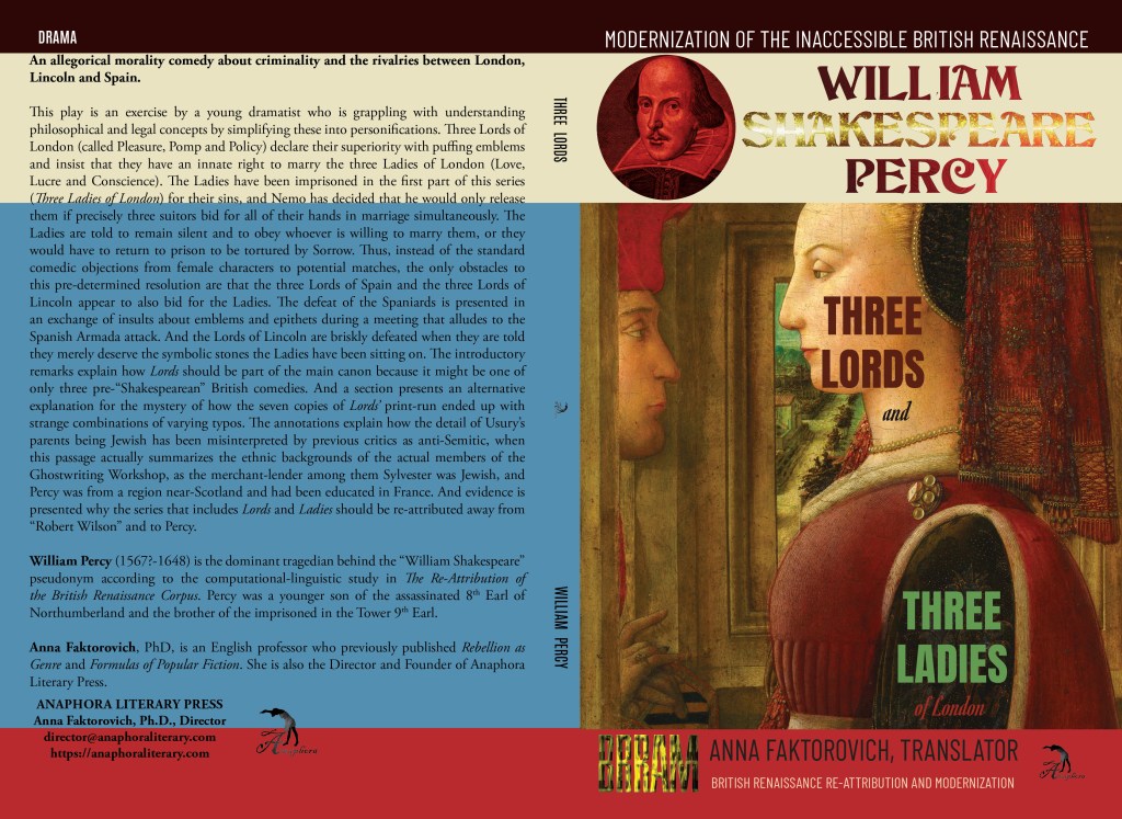 “The complete series on British Renaissance Re-Attribution and Modernization by Anna Faktorovich is a remarkable accomplishment. Based on her own unbiased method of computational-linguistic authorial-attribution, she has critically examined an entire collection of texts, many previously inaccessible and untranslated to modern English. From a variety of distinct factors that have been ignored or unnoticed in the past, she identifies a group of ghost writers behind many miss-attributed Renaissance works. Of particular interest are works traditionally attributed to William Shakespeare. Dr. Faktorovich is a prolific writer, very well informed in English literature, philology, and literary criticism, and she is clearly thorough and detail-oriented. Her re-attribution and modernization series demonstrates solid scholarship, fresh perspective, and willingness to challenge conventional thought and methodology.” —Midwest Book Review, Lesly F. Massey (December 2021)