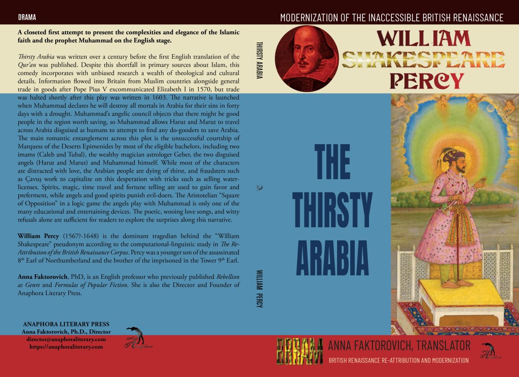 Thirsty Arabia was written over a century before the first English translation of the Qur’an was published. Despite this shortfall in primary sources about Islam, this comedy incorporates with unbiased research a wealth of theological and cultural details. Information flowed into Britain from Muslim countries alongside general trade in goods after Pope Pius V excommunicated Elizabeth I in 1570, but trade was halted shortly after this play was written in 1603. The narrative is launched when Muhammad declares he will destroy all mortals in Arabia for their sins in forty days with a drought. Muhammad’s angelic council objects that there might be good people in the region worth saving, so Muhammad allows Harut and Marut to travel across Arabia disguised as humans to attempt to find any do-gooders to save Arabia. The main romantic entanglement across this plot is the unsuccessful courtship of Marquess of the Deserts Epimenides by most of the eligible bachelors, including two imams (Caleb and Tubal), the wealthy magician astrologer Geber, the two disguised angels (Harut and Marut) and Muhammad himself. While most of the characters are distracted with love, the Arabian people are dying of thirst, and fraudsters such as Çavuş work to capitalize on this desperation with tricks such as selling water-licenses. Spirits, magic, time travel and fortune telling are used to gain favor and preferment, while angels and good spirits punish evil-doers. The Aristotelian “Square of Opposition” in a logic game the angels play with Muhammad is only one of the many educational and entertaining devices. The poetic, wooing love songs, and witty refusals alone are sufficient for readers to explore the surprises along this narrative.