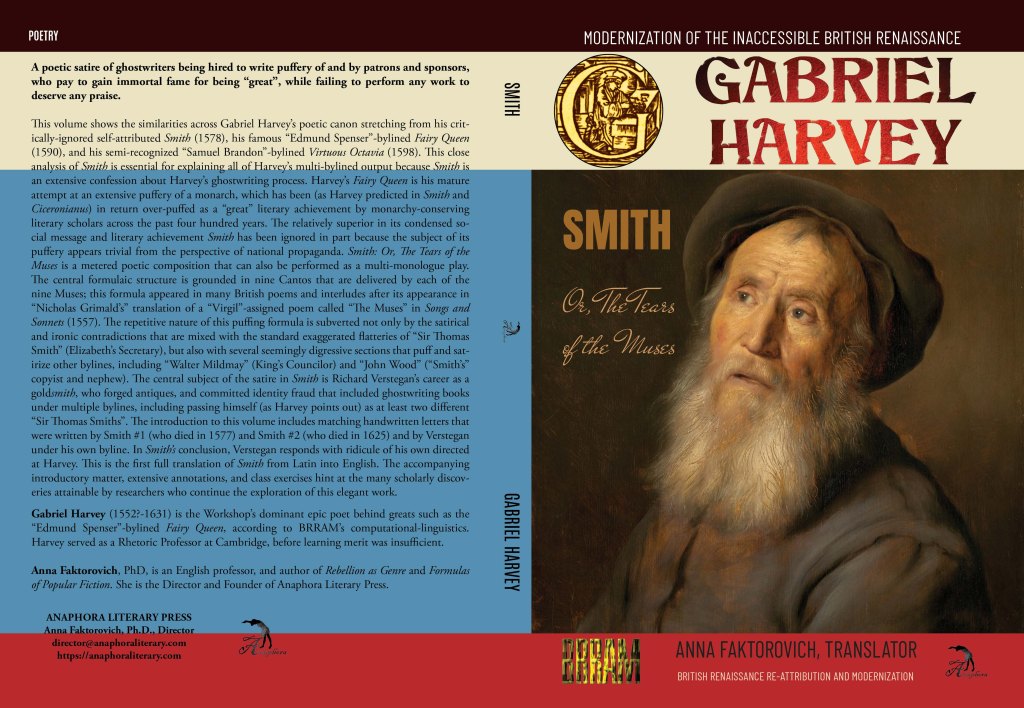 “Smith presents readers with a fascinating glimpse into Gabriel Harvey’s world of poetic satire and political commentary. Through Anna Faktorovich’s meticulous translation, Harvey’s 16th-century work sheds light on the intricacies of ghostwriting and the pursuit of fame in the literary and political spheres. The volume not only serves as a critical analysis of Harvey’s broader poetic canon but also provides valuable insights into the socio-political context of the Elizabethan era. One of the most intriguing aspects of Smith is its innovative structure, which blends metered poetry with the potential for performance as a multi-monologue play. The incorporation of nine Cantos, each delivered by one of the Muses, adds depth and complexity to Harvey’s critique of the cultural landscape of his time. Additionally, the inclusion of handwritten letters and extensive annotations enriches the reader’s understanding of the text, offering a glimpse into the scholarly discoveries awaiting further exploration. Overall, Smith is a thought-provoking work that invites readers to reconsider the nature of fame, authorship, and identity in the Renaissance period and beyond.” –Maynard S. Clark, LibraryThing