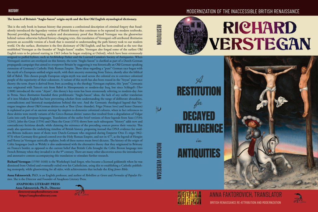 This is the only book in human history that presents a confessional description of criminal forgery that fraudulently introduced the legendary version of British history that continues to be repeated in modern textbooks. Richard Verstegan was the dominant artist and publisher in the British Ghostwriting Workshop that monopolized the print industry across a century. Scholars have previously described him as a professional goldsmith and exiled Catholic-propaganda publisher, but these qualifications merely prepared him to become a history forger and multi-sided theopolitical manipulator. The BRRAM series’ computational-linguistic method attributes most of the British Renaissance’s theological output, including the translation of the King James Bible, to Verstegan as its ghostwriter. Beyond providing handwriting analysis and documentary proof that Verstegan was the ghostwriter behind various otherwise bylined history-changing texts, this translation of Verstegan’s self-attributed Restitution presents an accessible version of a book that is essential to understanding the path history took to our modern world. On the surface, Restitution is the first dictionary of Old English, and has been credited as the text that established Verstegan as the founder of “Anglo-Saxon” studies. The “Exordium” reveals a much deeper significance behind these firsts by juxtaposing them against Verstegan’s letters and the history of the publication of the earliest Old English texts to be printed starting in 1565 (at the same time when Verstegan began his studies at Oxford). Verstegan is reinterpreted as the dominant forger and (self)-translator of these frequently non-existent manuscripts, whereas credit for these Old English translations has been erroneously assigned to puffed bylines such as Archbishop Parker and the Learned Camden’s Society of Antiquaries. When Verstegan’s motives are overlayed on this history, the term “Anglo-Saxon” is clarified as part of a Dutch-German propaganda campaign that aimed to overpower Britain by suggesting it was historically an Old German-speaking extension of Germany’s Catholic Holy Roman Empire. These ideas regarding a “pure” German race began with the myth of a European unified origin-myth, with their ancestry stemming from Tuisco, shortly after the biblical fall of Babel; Tuisco is described variedly as a tribal founder or as an idolatrous god on whom the term Teutonic is based. This chosen-people European origin-myth was used across the colonial era to convince colonized people of the superiority of their colonizers. A variant of this myth has also been reused in the “Aryan” pure-race theory; the term Aryan is derived from Iran; according to the theology Verstegan explains, this “pure” Germanic race originated with Tuisco’s exit from Babel in Mesopotamia or modern-day Iraq, but since Schlegel’s Über (1808) introduced the term “Aryan”, this theory’s key-term has been erroneously referring to modern-day Iran in Persia. Since Restitution founded these problematic “Anglo-Saxon” ideas, the lack of any earlier translation of it into Modern English has been preventing scholars from understanding the range of deliberate absurdities, contradictions and historical manipulations behind this text. And the Germanic theological legend that Verstegan imagines about Old German deities such as Thor (Zeus: thunder), Friga (Venus: love) and Seater (Saturn) is explained as part of an ancient attempt by empires to demonize colonized cultures, when in fact references to these deities were merely variants of the Greco-Roman deities’ names that resulted from a degradation of Vulgar Latin into early European languages. Translations of the earlier brief versions of these legends from Saxo (1534; 1234?), John the Great (1554) and Olaus the Great (1555) shows how each subsequent “history” adds new and contradictory fictitious details, while claiming the existence of the preceding sources proves their veracity. This study also questions the underlying timeline of British history, proposing instead that DNA evidence for modern-Britons indicates most of them were Dutch-Germans who migrated during Emperor Otto I’s reign (962-973) when Germany first gained control over the Holy Roman Empire, and not in 477, as the legend of Hengist and Horsa (as Verstegan satirically explains, both of these names mean horse) dictates. The history of the origin of Celtic languages (such as Welsh) is also undermined with the alternative theory that they originated in Brittany on France’s border, as opposed to the current belief that British Celts brought the Celtic Breton language into French Brittany when they invaded it in the 9th century. There are many other discoveries across the introductory and annotative content accompanying this translation to stimulate further research.