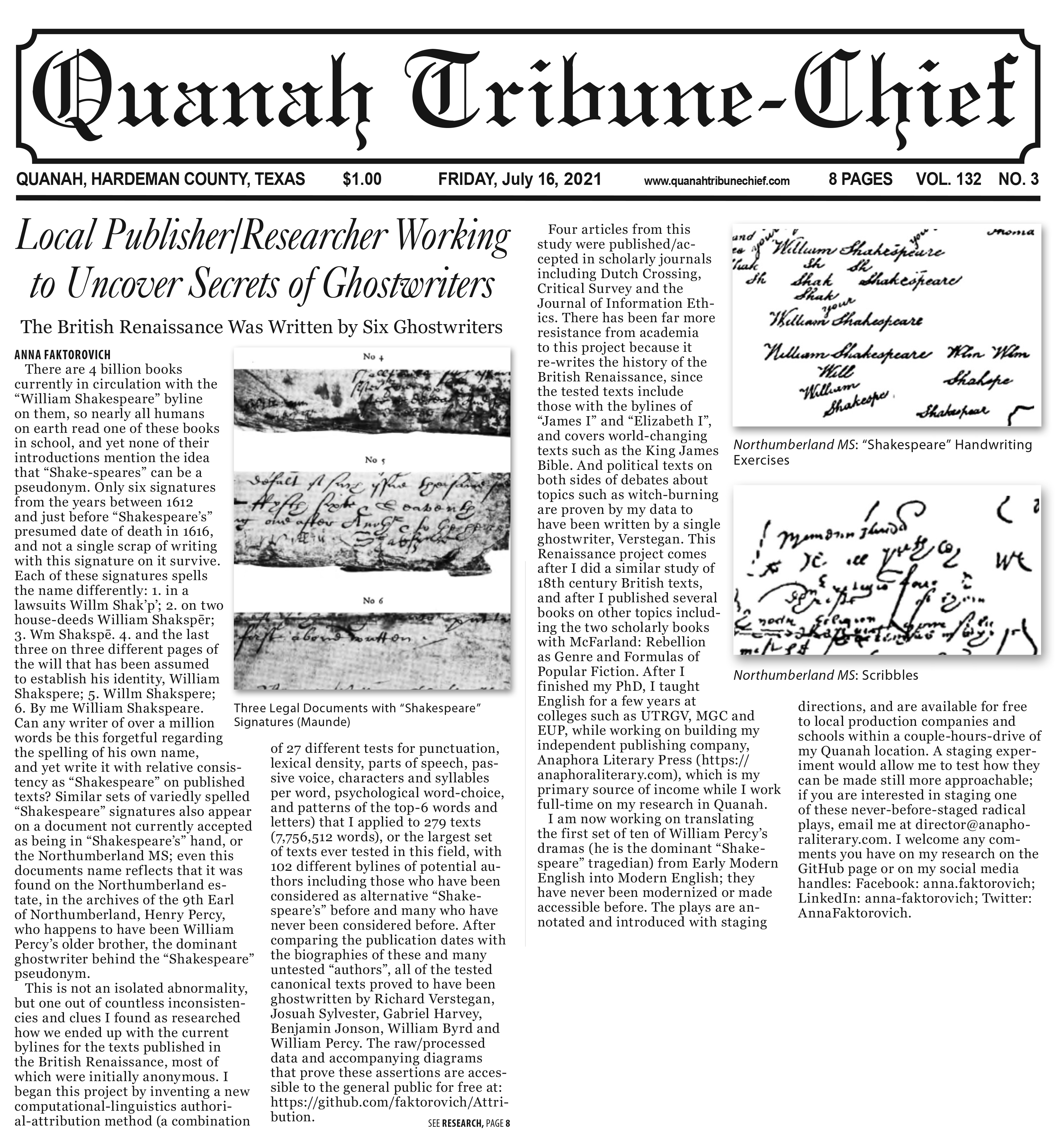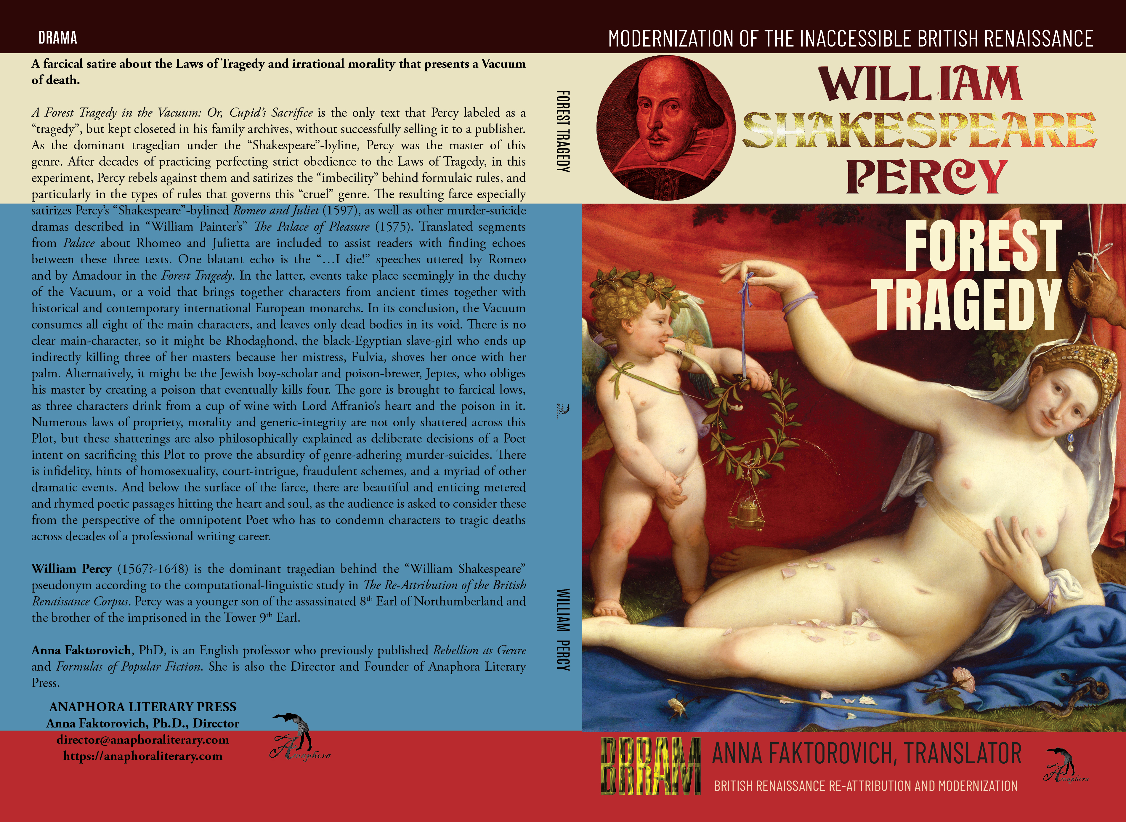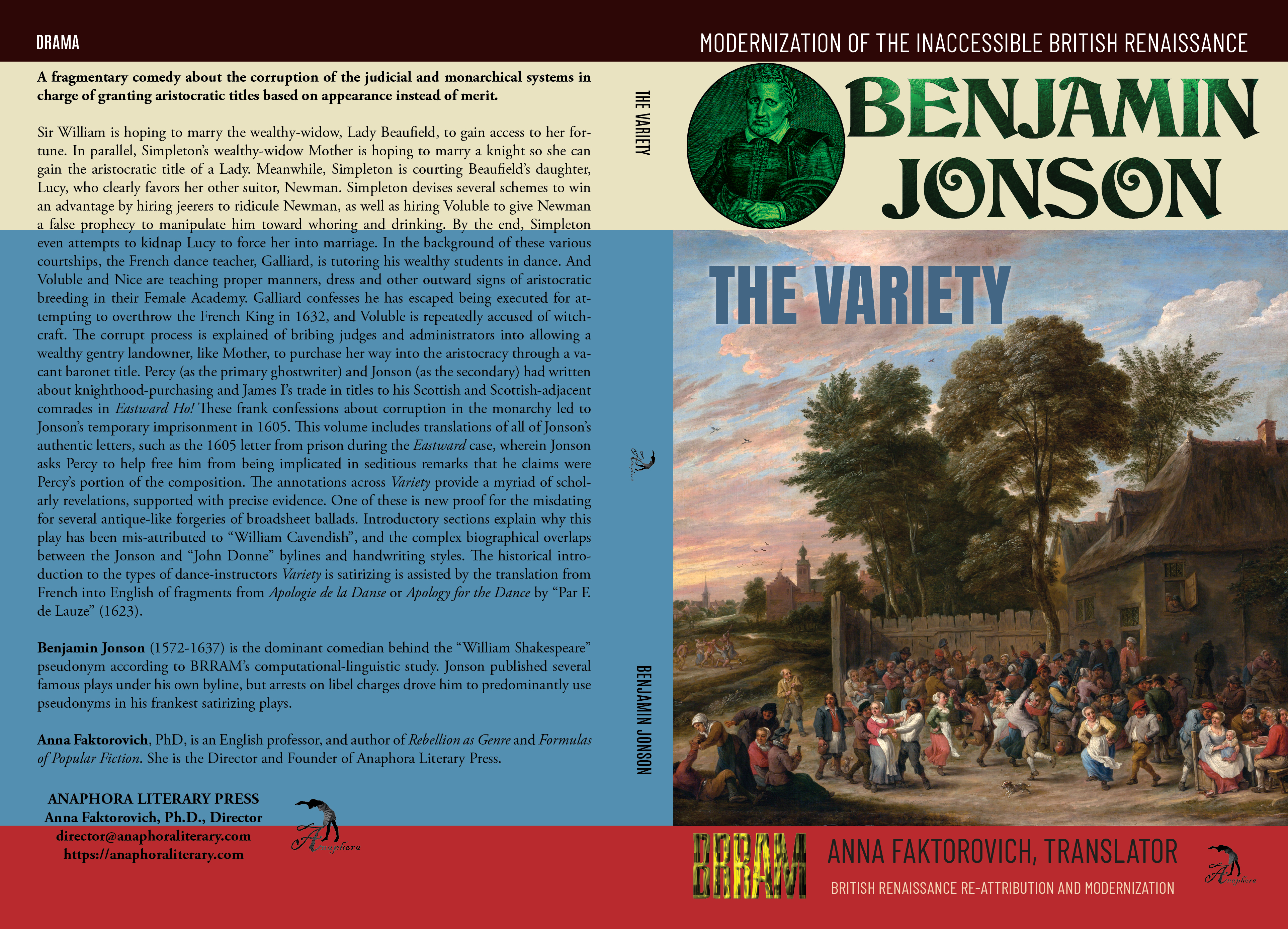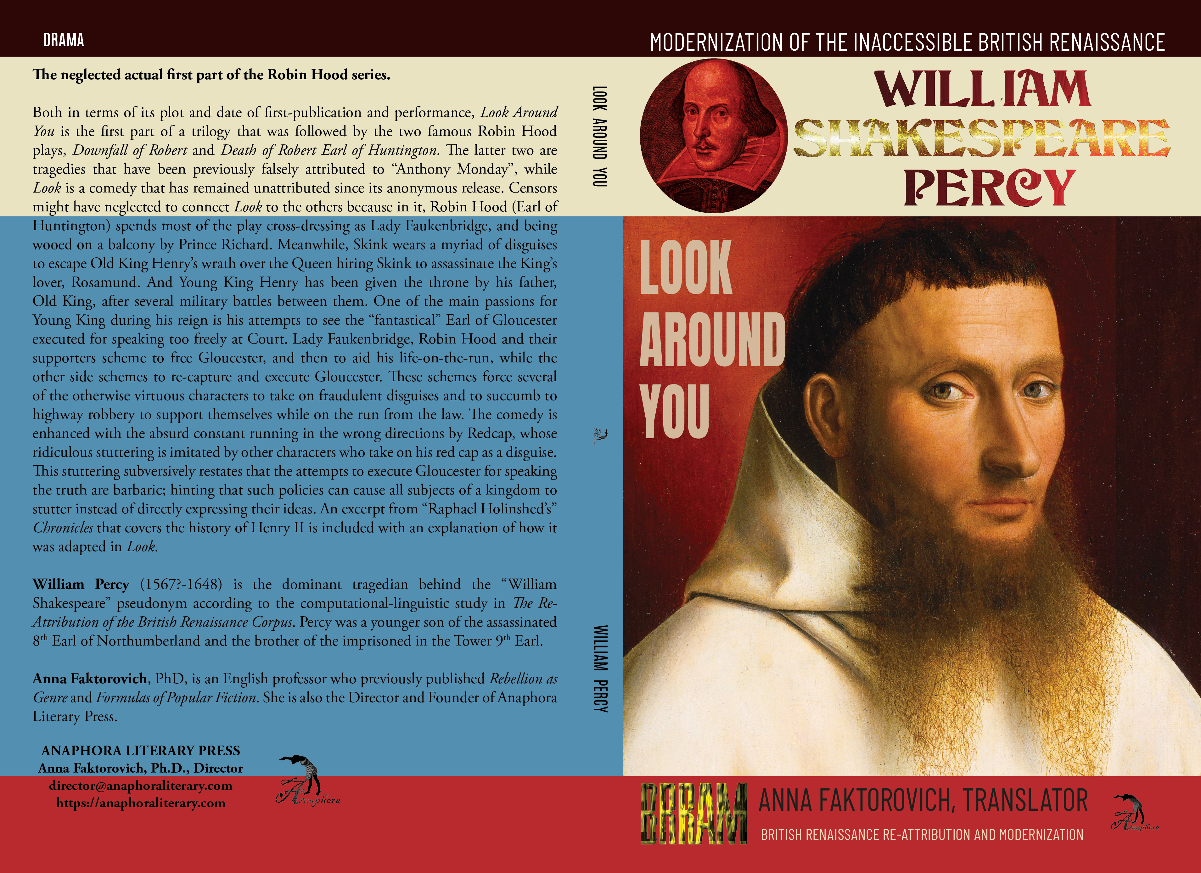 “The complete series on British Renaissance Re-Attribution and Modernization by Anna Faktorovich is a remarkable accomplishment. Based on her own unbiased method of computational-linguistic authorial-attribution, she has critically examined an entire collection of texts, many previously inaccessible and untranslated to modern English. From a variety of distinct factors that have been ignored or unnoticed in the past, she identifies a group of ghost writers behind many miss-attributed Renaissance works. Of particular interest are works traditionally attributed to William Shakespeare. Dr. Faktorovich is a prolific writer, very well informed in English literature, philology, and literary criticism, and she is clearly thorough and detail-oriented. Her re-attribution and modernization series demonstrates solid scholarship, fresh perspective, and willingness to challenge conventional thought and methodology.” —Midwest Book Review, Lesly F. Massey (December 2021)