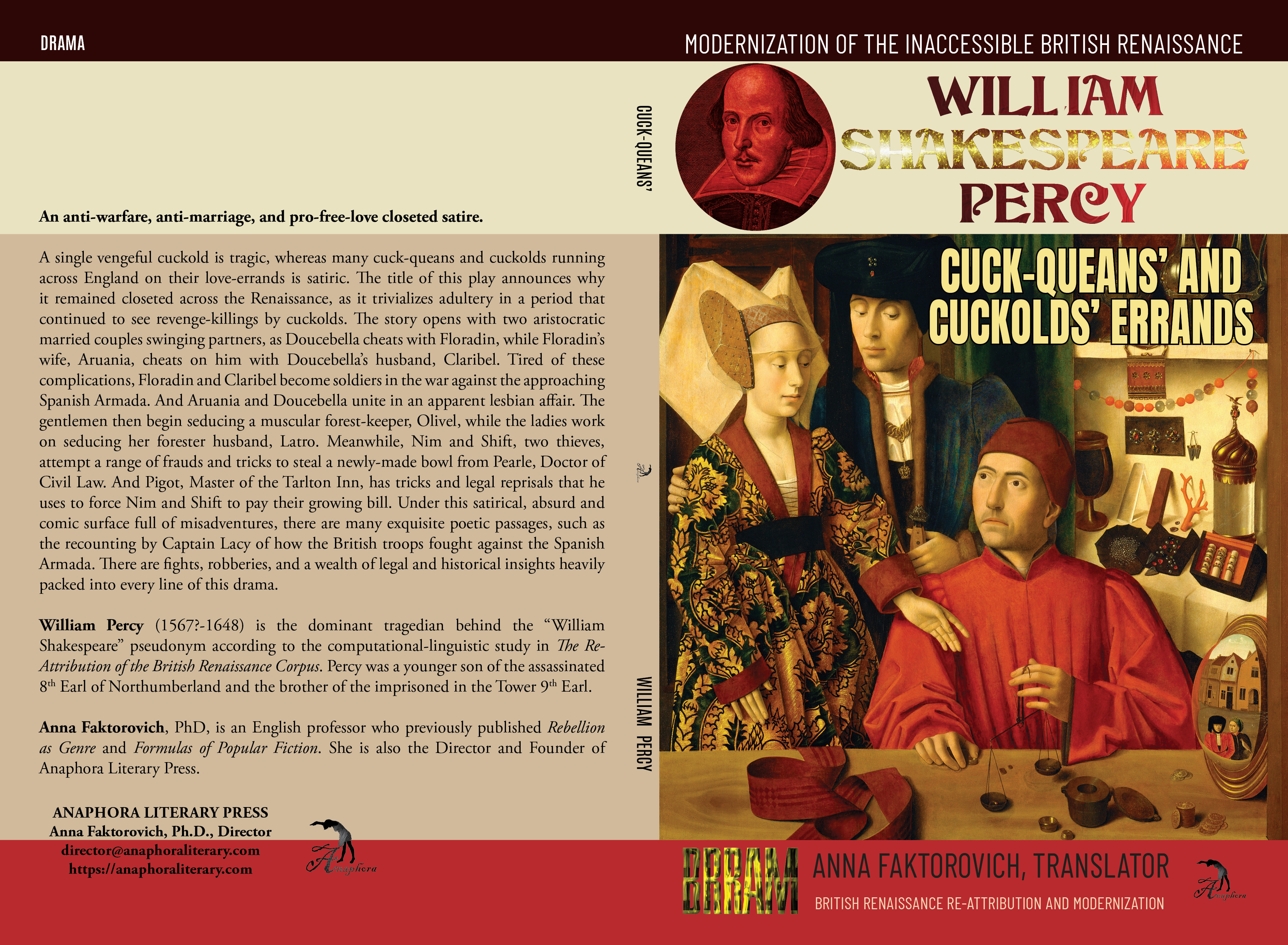 “It is tempting to read Cuck-queans and Cuckolds Errands superficially, to enjoy its façade, which has been much enhanced by Faktorovich’s extensive and erudite introduction and footnotes./ Frankly, without those and without her careful modernization of language, the original work would be nearly unreadable. At that superficial level, the reader finds much enjoyment in its satire and slightly puerile humor. Human coitus, especially if illicit, is after all, the world’s most fascinating and enduring topic./ The cuckoo is a bird of European origin, about the size of a robin who displays the disconcerting habit of laying eggs in another bird’s nest. The derivatives ‘cuckold’ and ‘cuck-quean’ describe a usurper or supplanter, hence one who practices the pleasures of venery outside the boundaries of holy matrimony. And the drama Cuck-queans and Cuckolds Errands is about just that, obsessive and nearly random fornication./ But there is a deeper level to Cuckolds. The reader wishing to access that level might do well to first read Jokes and their Relation to the Subconscious by Sigmund Freud. All of human vulnerability and sexual peccadillos, deviant and sanctioned, are displayed in this writing, which was self-attributed in William Percy’s (obscure poet of the 17th century) closeted manuscripts. The reference to Freud above is intended to imply the ubiquity of this pattern of behavior and its persistence from age to age; humankind is steeped in concupiscence. Percy’s drama is a paean to joy and jouissance, a celebration of what it is to be alive./ The drama itself tells of the peregrinations and loves and fates of a dozen players. Prominent among them are two spouse swapping couples: Doucebella and Claribel, and Aruania and Floridan who couple in various permutations, including a Lesbian encounter. The drama is replete with absurd miscreants: thieves who steal from a doctor, a masculine but desirable gamekeeper and her husband, an innkeeper and two deadbeat customers. The reader will enjoy many hours dis-entangling this menage./ In the language of Percy’s drama, the reader will hear tones and rhythms and phrases suggestive of Shakespeare—and no wonder: Faktorovich establishes Percy as a ghost writer for Shakespeare. For example, a witch in Macbeth says, ‘By the pricking of my thumbs, something wicked this way comes.’/ And in Percy’s drama (p105), ‘Beset the pricking enclosure of my conscience…’ Cuckolds would be a great read if it were only for the fun of detecting such similarities. I commend it to you.” —Midwest Book Review, Lloyd Jacobs (December 2021)