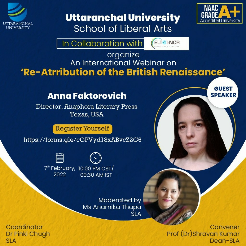 Guest Speaker on “Re-Attribution of the British Renaissance” at the School of Liberal Arts of Uttaranchal University, India, February 7, 2022, 10pm CST: Free to Participate.