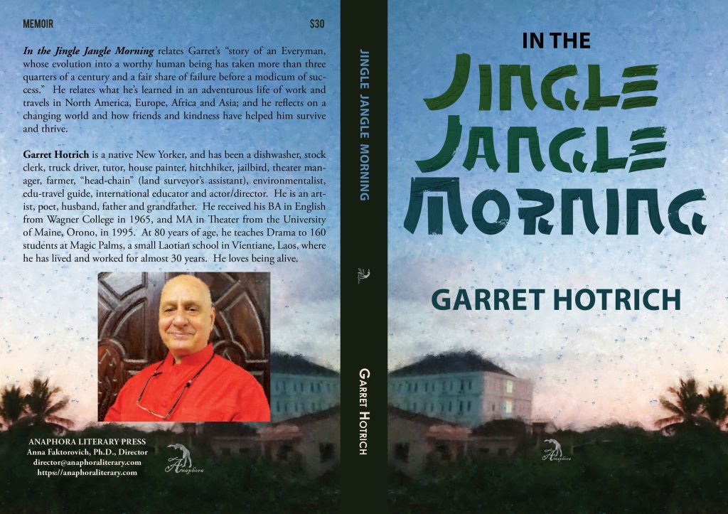 Garret Hotrich is a native New Yorker, and has been a dishwasher, stock clerk, truck driver, tutor, house painter, hitchhiker, jailbird, theater manager, farmer, “head-chain” (land surveyor’s assistant), environmentalist, edu-travel guide, international educator and actor/director. He is an artist, poet, husband, father and grandfather. He received his BA in English from Wagner College in 1965, and MA in Theater from the University of Maine, Orono, in 1995. At 80 years of age, he teaches Drama to 160 students at Magic Palms, a small Laotian school in Vientiane, Laos, where he has lived and worked for almost 30 years. He loves being alive.