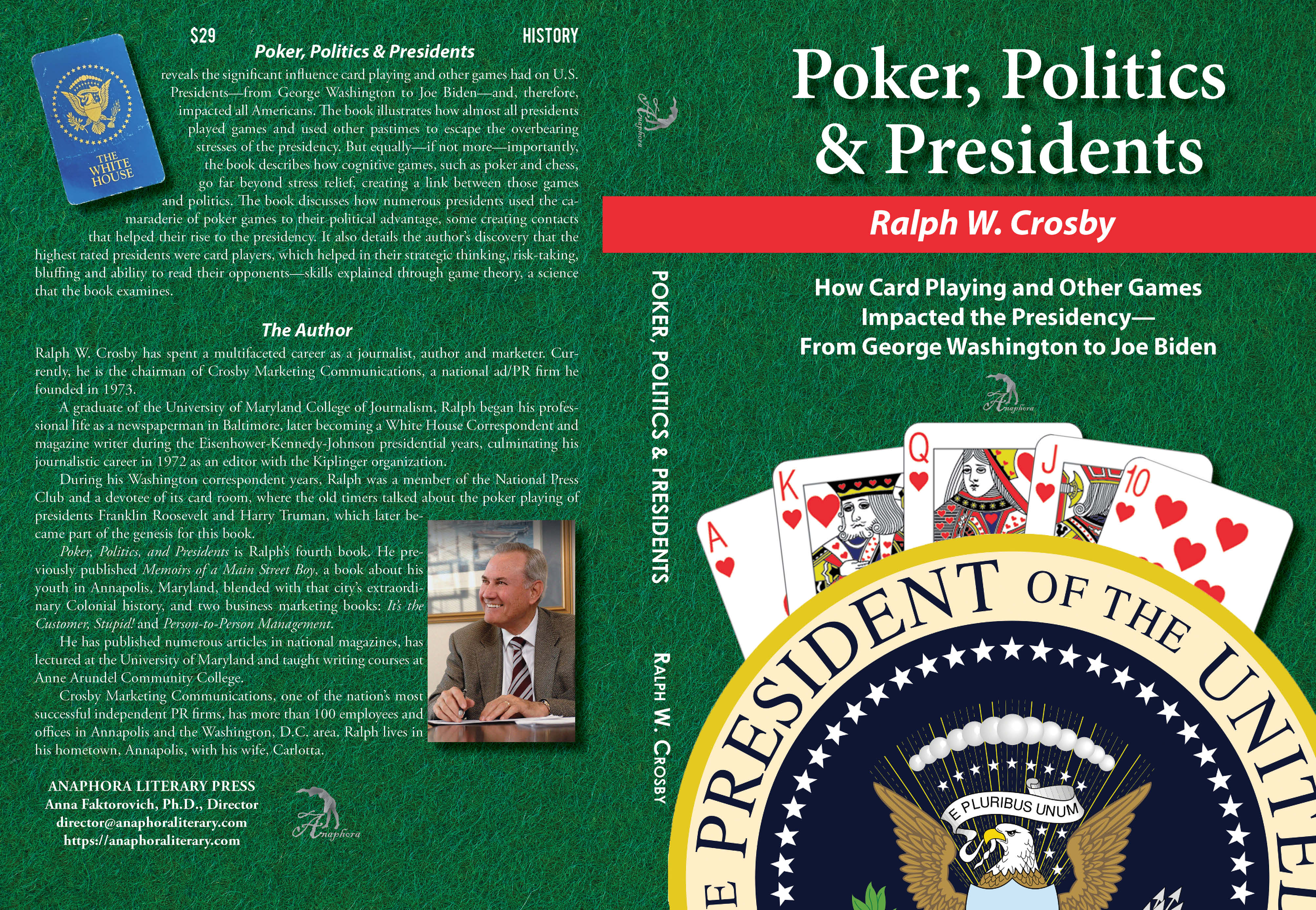 Poker, Politics & Presidents: How Card Playing and Other Games Impacted the Presidency—From George Washington to Joe Biden (Softcover: $29: 450pp, 6X9”, ISBN: 979-8-378603-95-4; Hardcover: $34: ISBN: 979-8-378604-21-0; Kindle: $2.99; LCCN: 2023903383; Nonfiction—Political Science—Political Process—Leadership; Released: February 28, 2023; Purchase on Amazon) reveals the significant influence card playing and other games had on U.S. Presidents—from George Washington to Joe Biden—and, therefore, impacted all Americans. The book illustrates how almost all presidents played games and used other pastimes to escape the overbearing stresses of the presidency. But equally—if not more—importantly, the book describes how cognitive games, such as poker and chess, go far beyond stress relief, creating a link between those games and politics. The book discusses how numerous presidents used the camaraderie of poker games to their political advantage, some creating contacts that helped their rise to the presidency. It also details the author’s discovery that the highest rated presidents were card players, which helped in their strategic thinking, risk-taking, bluffing and ability to read their opponents—skills explained through game theory, a science that the book examines.