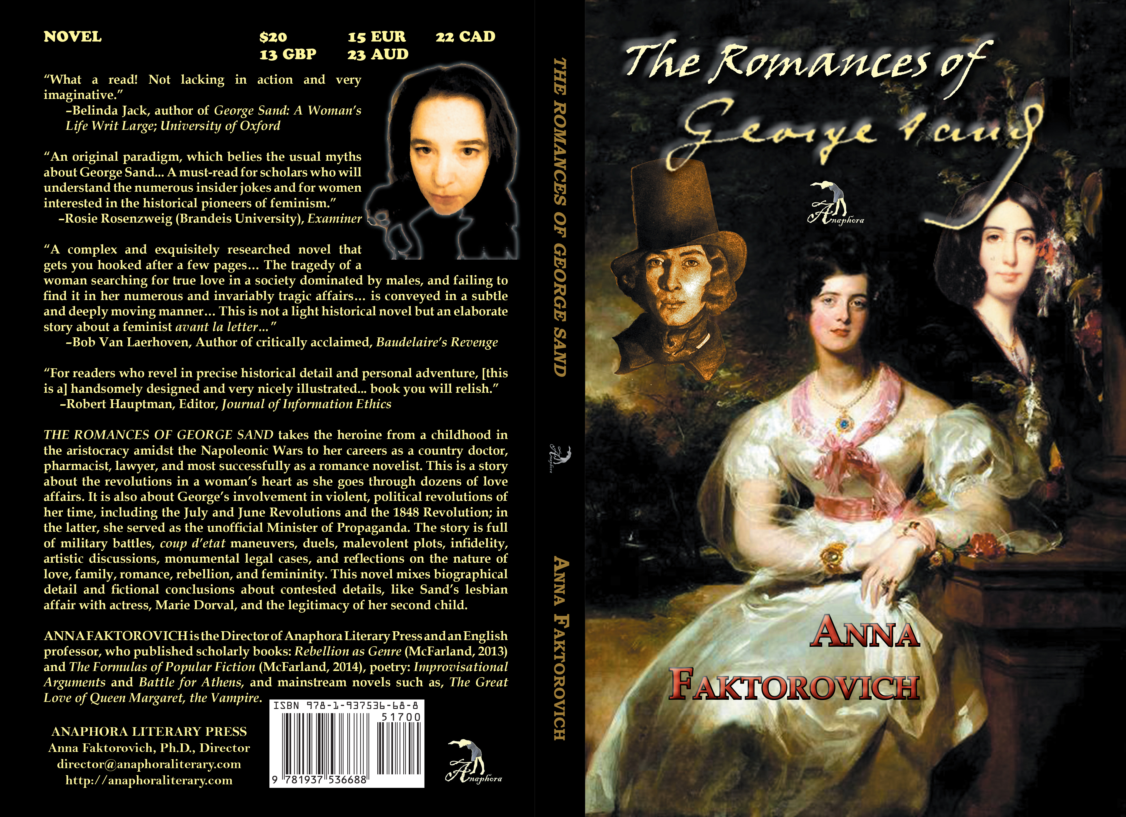 “Anna Faktorovich has succeeded in writing a historical novel about George Sand… that is pleasing to read for readers of literary historical fiction and scholars alike… a complex and exquisitely researched novel that gets you hooked after a few pages… The tragedy of a woman searching for true love in a society dominated by males, and failing to find it in her numerous and invariably tragic affairs… is conveyed in a subtle and deeply moving manner… This is not a light historical novel but an elaborate story about a feminist avant la letter…” —Bob Van Laerhoven, Author of critically acclaimed, Baudelaire’s Revenge (Pegasus Books)