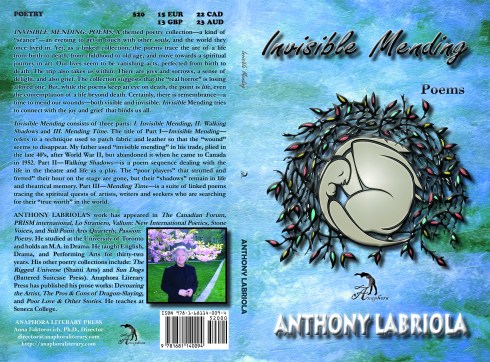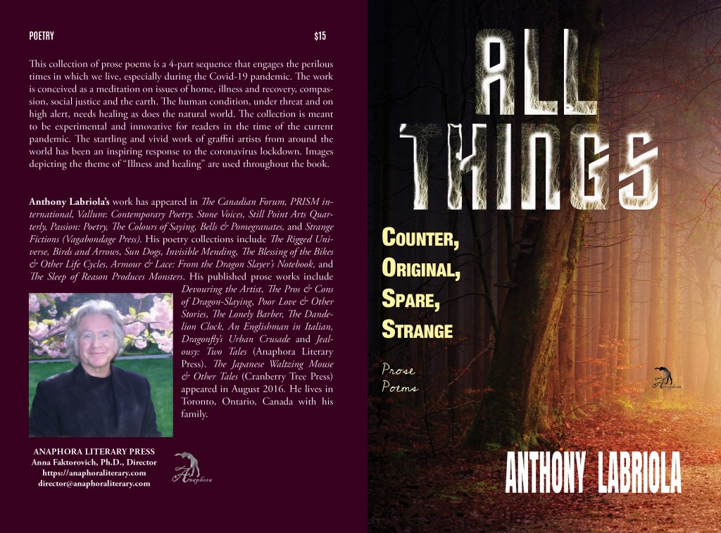 Anthony Labriola’s work has appeared in The Canadian Forum, PRISM international, Vallum: Contemporary Poetry, Stone Voices, Still Point Arts Quarterly, Passion: Poetry, and The Colours of Saying. His poetry collections include The Rigged Universe (Shanti Arts Publishing), Sun Dogs (Battered Suitcase Press), Invisible Mending (Anaphora Literary Press), and The Blessing of the Bikes & Other Life Cycles (Anaphora Literary Press). His published prose works include Devouring the Artist (Anaphora Literary Press), The Pros & Cons of Dragon-Slaying (Anaphora Literary Press) and Poor Love & Other Stories (Anaphora Literary Press). The Japanese Waltzing Mouse & Other Tales (Cranberry Tree Press) appeared in August 2016. He lives in Toronto with his family. He studied at the University of Toronto and received a B.A. in English and French, a B.Ed. in English and Dramatic Arts, and an M.A. from the Graduate Centre for the Study of Drama. He taught English, Drama and Performing Arts for 32 years. Then went on to teach Life Writing at Seneca College in Toronto, Ontario.