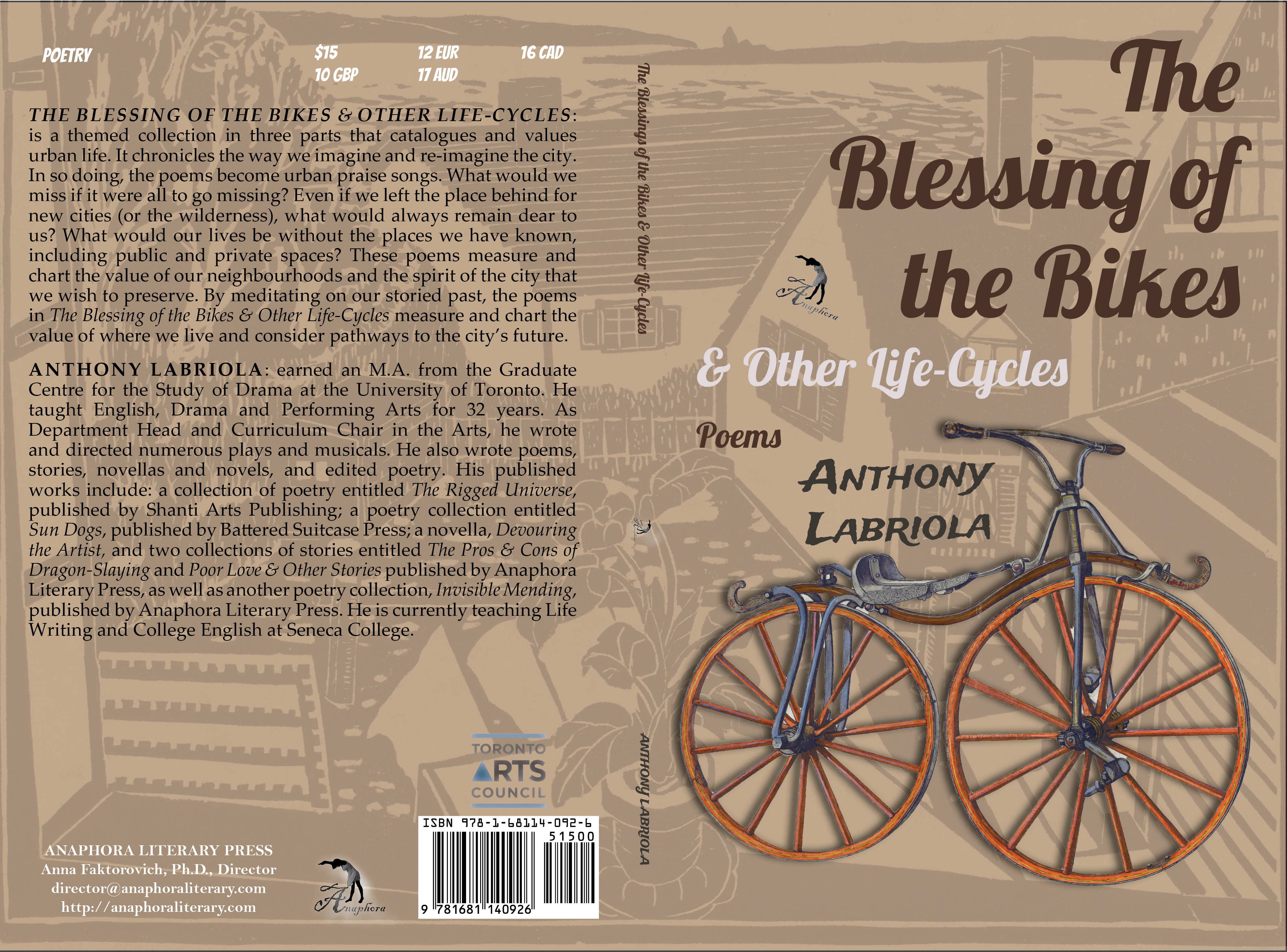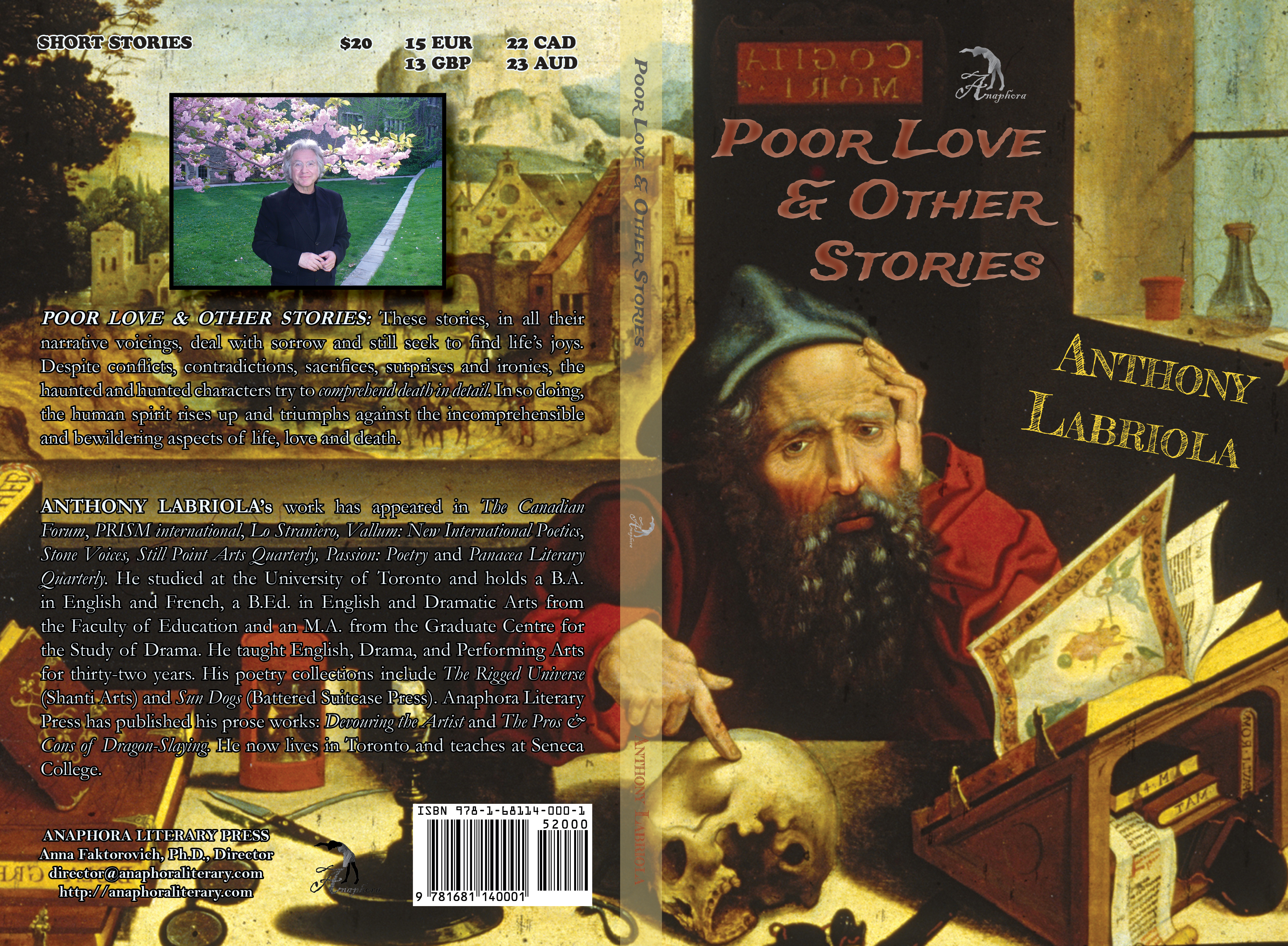 Anthony Labriola’s work has appeared in The Canadian Forum, PRISM international, Vallum: Contemporary Poetry, Stone Voices, Still Point Arts Quarterly, Passion: Poetry, and The Colours of Saying. His poetry collections include The Rigged Universe (Shanti Arts Publishing), Sun Dogs (Battered Suitcase Press), Invisible Mending (Anaphora Literary Press), and The Blessing of the Bikes & Other Life Cycles (Anaphora Literary Press). His published prose works include Devouring the Artist (Anaphora Literary Press), The Pros & Cons of Dragon-Slaying (Anaphora Literary Press) and Poor Love & Other Stories (Anaphora Literary Press). The Japanese Waltzing Mouse & Other Tales (Cranberry Tree Press) appeared in August 2016. He lives in Toronto with his family. He studied at the University of Toronto and received a B.A. in English and French, a B.Ed. in English and Dramatic Arts, and an M.A. from the Graduate Centre for the Study of Drama. He taught English, Drama and Performing Arts for 32 years. Then went on to teach Life Writing at Seneca College in Toronto, Ontario.