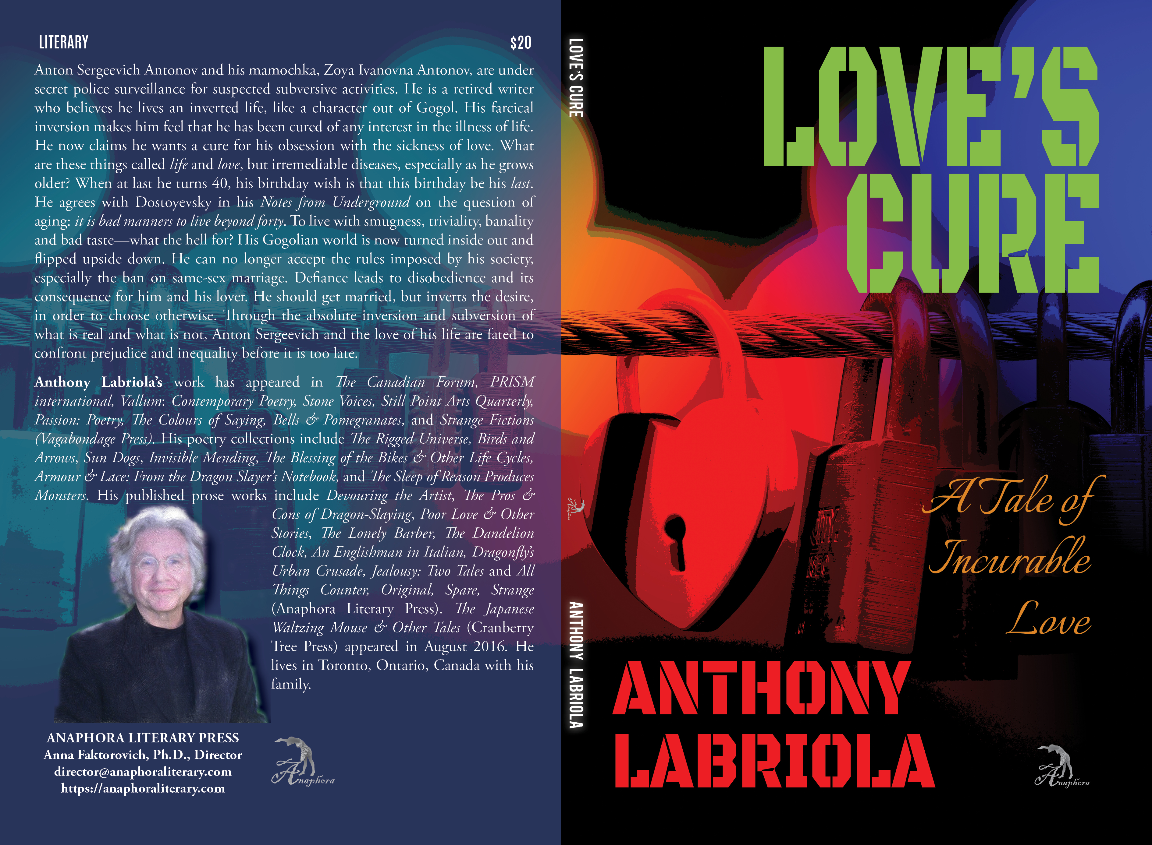 Love’s Cure: A Tale of Incurable Love: ($20, 140pp, 6X9”: Softcover: 979-8-53123-855-9; $35: Hardcover: 978-1-68114-556-3; LCCN: 2021913656; $2.99: Kindle EBook; Fiction—Literary; Release: July 5, 2021; Purchase on Amazon in Softcover or Kindle; or from Barnes & Noble): Anton Sergeevich Antonov and his mamochka, Zoya Ivanovna Antonov, are under secret police surveillance for suspected subversive activities. He is a retired writer who believes he lives an inverted life, like a character out of Gogol. His farcical inversion makes him feel that he has been cured of any interest in the illness of life. He now claims he wants a cure for his obsession with the sickness of love. What are these things called life and love, but irremediable diseases, especially as he grows older? When at last he turns 40, his birthday wish is that this birthday be his last. He agrees with Dostoyevsky in his Notes from Underground on the question of aging: it is bad manners to live beyond forty. To live with smugness, triviality, banality and bad taste—what the hell for? His Gogolian world is now turned inside out and flipped upside down. He can no longer accept the rules imposed by his society, especially the ban on same-sex marriage. Defiance leads to disobedience and its consequence for him and his lover. He should get married, but inverts the desire, in order to choose otherwise. Through the absolute inversion and subversion of what is real and what is not, Anton Sergeevich and the love of his life are fated to confront prejudice and inequality before it is too late.