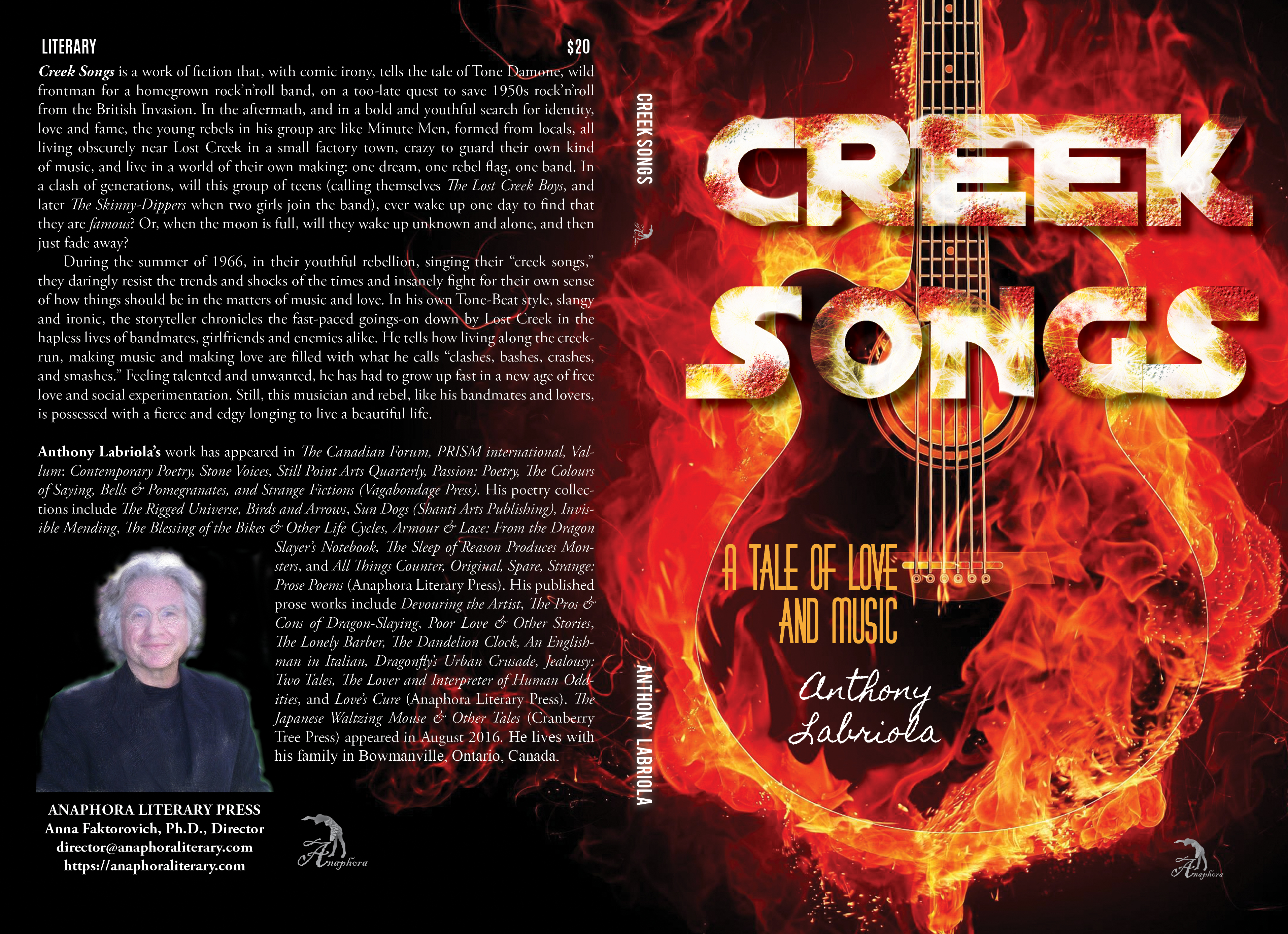 Creek Songs: A Tale of Love and Music: (Softcover: $20, 198pp, 6X9”: 979-8-482542-08-8; Hardcover: $35: 979-8-482542-97-2; Kindle EBook; LCCN: 2021919603; Fiction—Cultural Heritage; Release: October 1, 2021; Purchase on Amazon): is a work of fiction that, with comic irony, tells the tale of Tone Damone, wild frontman for a homegrown rock’n’roll band, on a too-late quest to save 1950s rock’n’roll from the British Invasion. In the aftermath, and in a bold and youthful search for identity, love and fame, the young rebels in his group are like Minute Men, formed from locals, all living obscurely near Lost Creek in a small factory town, crazy to guard their own kind of music, and live in a world of their own making: one dream, one rebel flag, one band. In a clash of generations, will this group of teens (calling themselves The Lost Creek Boys, and later The Skinny-Dippers when two girls join the band), ever wake up one day to find that they are famous? Or, when the moon is full, will they wake up unknown and alone, and then just fade away? During the summer of 1966, in their youthful rebellion, singing their “creek songs,” they daringly resist the trends and shocks of the times and insanely fight for their own sense of how things should be in the matters of music and love. In his own Tone-Beat style, slangy and ironic, the storyteller chronicles the fast-paced goings-on down by Lost Creek in the hapless lives of bandmates, girlfriends and enemies alike. He tells how living along the creek-run, making music and making love are filled with what he calls “clashes, bashes, crashes, and smashes.” Feeling talented and unwanted, he has had to grow up fast in a new age of free love and social experimentation. Still, this musician and rebel, like his bandmates and lovers, is possessed with a fierce and edgy longing to live a beautiful life.