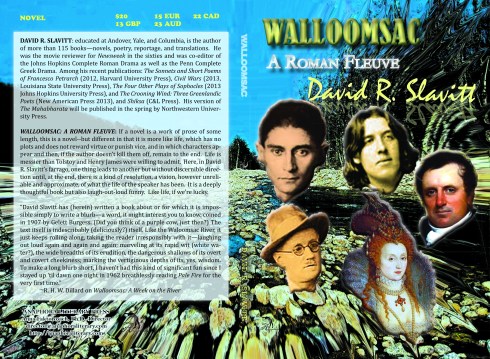 Walloomsac: A Roman Fleuve: ($20, ISBN: 978-1-937536-90-9, EBook ISBN: 978-1-68114-026-1, LCCN: 2014952145, 176pp, 6X9”, October 2014; purchase on: CreateSpace, Barnes and Noble, and Amazon; Kindle, EBSCO and TotalBooX editions: $2.99): If a novel is a work of prose of some length, this is a novel–but different in that it is more like life, which has no plots and does not reward virtue or punish vice, and in which characters appear and then, if the author doesn’t kill them off, remain to the end. Life is messier than Tolstoy and Henry James were willing to admit. Here, in David R. Slavitt’s farrago, one thing leads to another but without discernible direction until, at the end, there is a kind of resolution, a vision, however unreliable and approximate, of what the life of the speaker has been. It is a deeply thoughtful book but also laugh-out-loud funny. Like life, if we’re lucky.