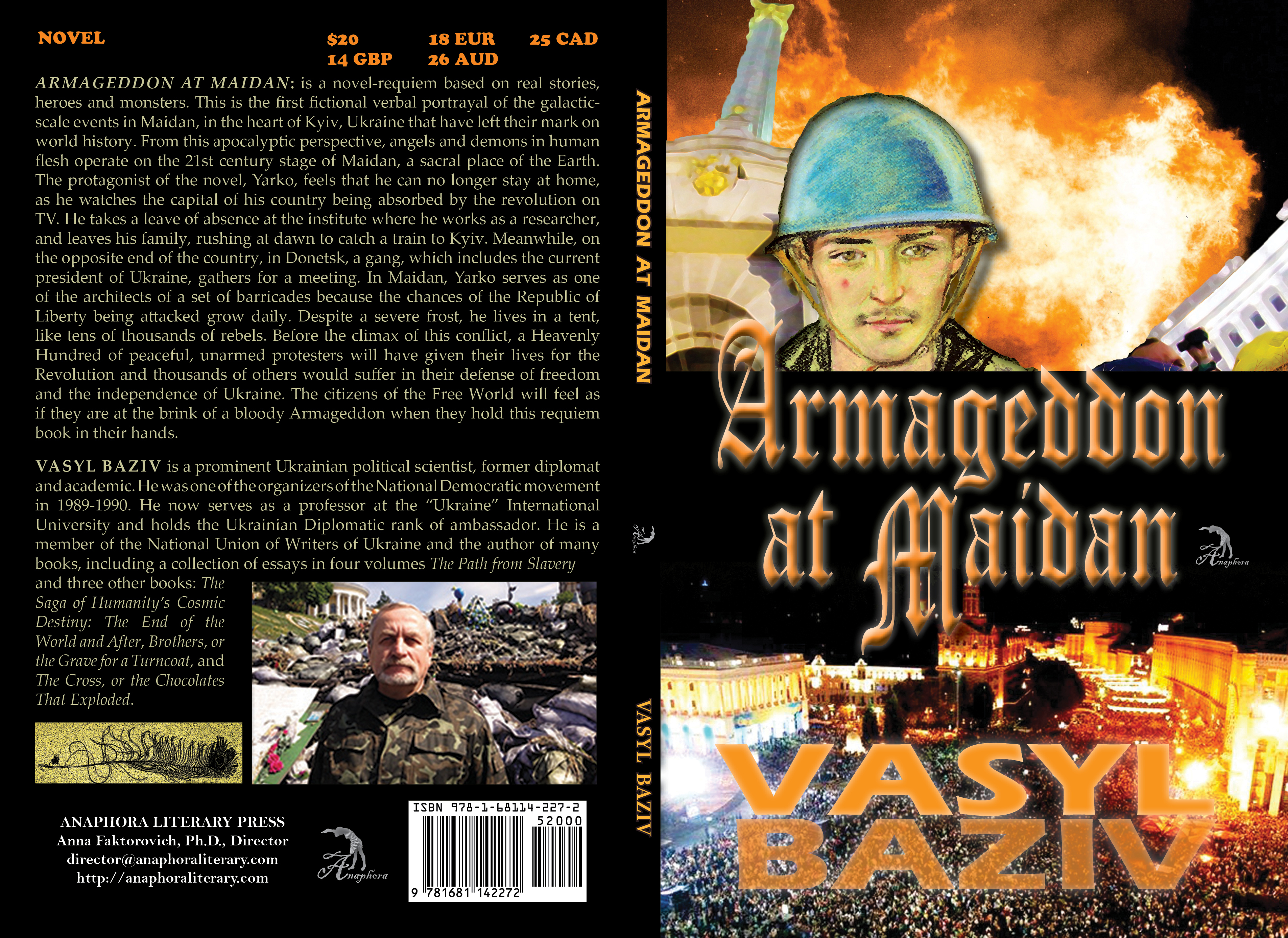 Armageddon at Maidan: ($20, 166pp, 6X9″, Print ISBN-13: 978-1-68114-227-2, EBook ISBN-13: 978-1-68114-228-9, LCCN: 2015959445, 45 color photographs by Valerian Antonovych and Lesia Lutsiv, Edited by Kristen Noy, January 2016; Purchase on Amazon or Barnes & Noble): is a novel-requiem based on real stories, heroes and monsters. This is the first fictional verbal portrayal of the galactic-scale events in Maidan, in the heart of Kyiv, Ukraine that have left their mark on world history. From this apocalyptic perspective, angels and demons in human flesh operate on the 21st century stage of Maidan, a sacral place of the Earth. The protagonist of the novel, Yarko, feels that he can no longer stay at home, as he watches the capital of his country being absorbed by the revolution on TV. He takes a leave of absence at the institute where he works as a researcher, and leaves his family, rushing at dawn to catch a train to Kyiv. Meanwhile, on the opposite end of the country, in Donetsk, a gang, which includes the current president of Ukraine, gathers for a meeting. In Maidan, Yarko serves as one of the architects of a set of barricades because the chances of the Republic of Liberty being attacked grow daily. Despite a severe frost, he lives in a tent, like tens of thousands of rebels. Before the climax of this conflict, a Heavenly Hundred of peaceful, unarmed protesters will have given their lives for the Revolution and thousands of others would suffer in their defense of freedom and the independence of Ukraine. The citizens of the Free World will feel as if they are at the brink of a bloody Armageddon when they hold this requiem book in their hands.