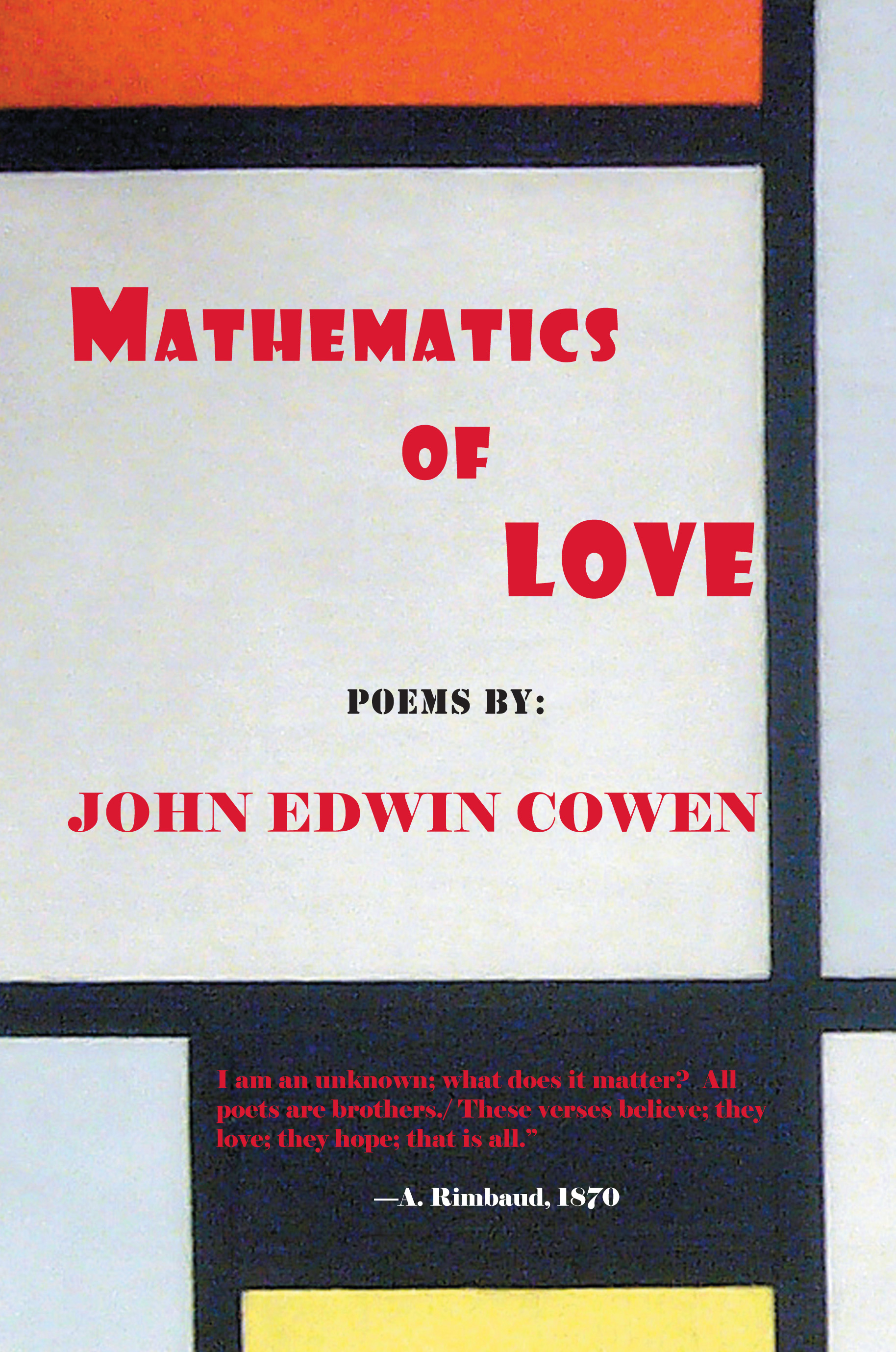 Mathematics of Love (Soft Cover $15 – Click to Purchase; Amazon Soft Cover: $15: 979-8-588705-20-2; Hard Cover $30, ISBNS: 978-1-937536-01-5/ 978-1-937536-08-4, LCCN: 2011939734, 6X9″, 134pp): “Like his mentor Jose Garcia Villa, John Edwin Cowen is a brave poet. He takes poetic risks with language and the result is often a beautiful flower behind the barbed wire of craftsmanship. I love the variety of poems in Mathematics of Love and the charged-up voice that powers all the work. He can be tender, challenging, energetic, and as complex musically as Villa and his other love, Dylan Thomas.