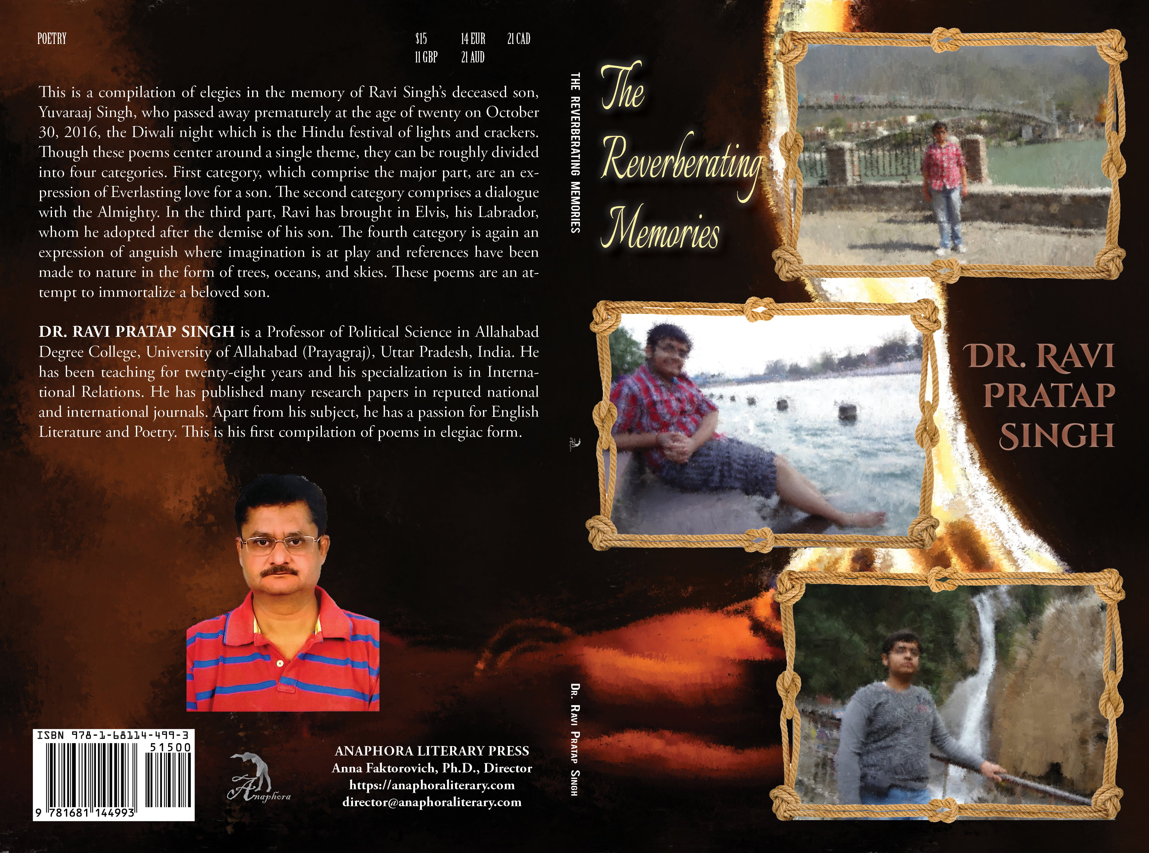 The Reverberating Memories: (Softcover: $15, 84pp, 6X9”: ISBN-13: 978-1-68114-499-3; Hardcover: $30: ISBN-13: 978-1-68114-500-6; EBook: $2.99: ISBN-13: 978-1-68114-501-3; Amazon Soft Cover: ISBN: 979-8-595623-25-4; Kindle eBook: ASIN: B08T71XYMB; LCCN: 2019904514; Poetry—Subjects & Themes—Death, Grief, Loss; Release: July 27, 2019; Purchase on Amazon or Barnes & Noble): This is a compilation of elegies in the memory of Ravi Singh’s deceased son, Yuvaraaj Singh, who passed away prematurely at the age of twenty on October 30, 2016, the Diwali night which is the Hindu festival of lights and crackers. Though these poems center around a single theme, they can be roughly divided into four categories. First category, which comprise the major part, are an expression of Everlasting love for a son. The second category comprises a dialogue with the Almighty. In the third part, Ravi has brought in Elvis, his Labrador, whom he adopted after the demise of his son. The fourth category is again an expression of anguish where imagination is at play and references have been made to nature in the form of trees, oceans, and skies. These poems are an attempt to immortalize a beloved son.