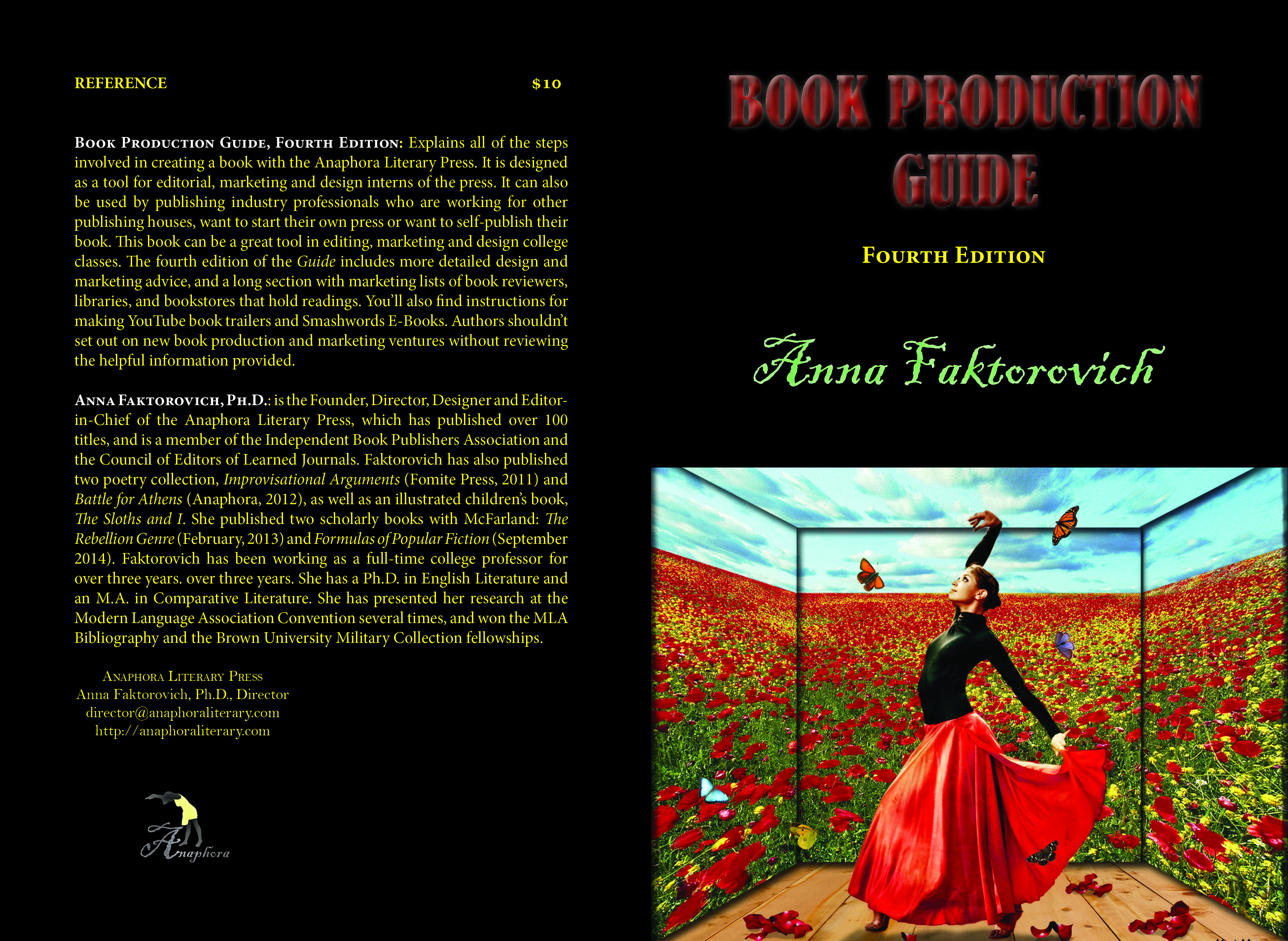 Book Production Guide (Soft Cover: $10, ISBN: 978-1-937536-25-1; Smashwords Edition: $2.99, ISBN: 978-1-310227-87-5; Nook Edition: Free; LCCN: 2012907287, 138pp, 6X9″, October 2014, 4th Edition; Purchase on Amazon or Barnes and Noble): Explains all of the steps involved in creating a book with the Anaphora Literary Press. It is designed as a tool for editorial, marketing and design interns of the press. It can also be used by publishing industry professionals who are working for other publishing houses, want to start their own press or want to self-publish their book. This book can be a great tool in editing, marketing and design college classes. The fourth edition of the Guide includes more detailed design and marketing advice, and a long section with marketing lists of book reviewers, libraries, and bookstores that hold readings. You’ll also find instructions for making YouTube book trailers and Smashwords E-Books. Authors shouldn’t set out on new book production and marketing ventures without reviewing the helpful information provided.