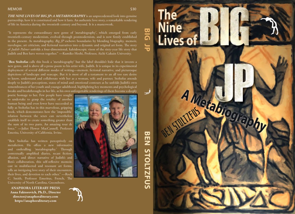 The Nine Lives of BIG JP: A Metabiography: (Softcover: $30: ISBN: 978-1-68114-625-6: 218pp, 6X9”, standard color; Hardcover: $40: ISBN: 978-1-68114-626-3, premium color; Kindle: $2.99; LCCN: 2025909738; Biographies & Memoirs—Arts & Literature—Artists, Architects & Photographers; Release: May 10, 2025; Purchase on Amazon): is an unprecedented look into genuine partnership, how it is constituted and how it lasts. An authentic love story, a remarkable rendering of life in America during the twentieth century and beyond. It is a masterwork.