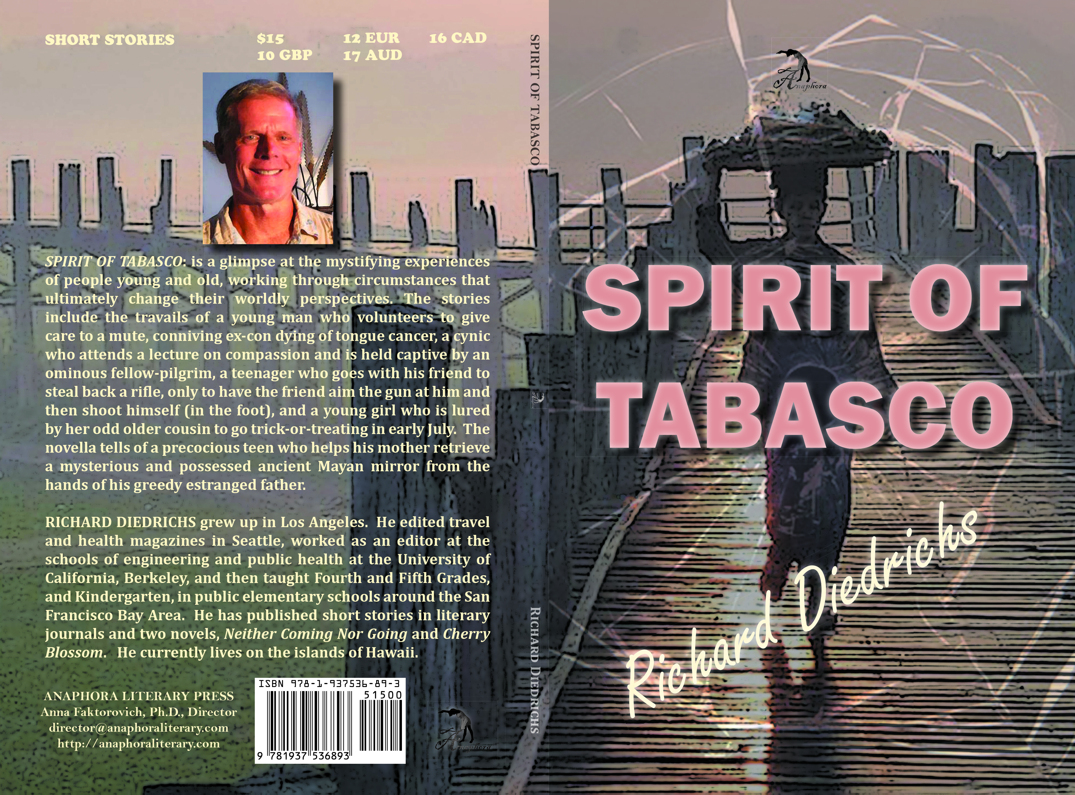 Spirit of Tabasco: ($15, ISBN: 978-1-937536-89-3, Hardcover ISBN: 978-1-68114-126-8, LCCN: 2014951609, 110pp, 6X9″, October 2014; Buy on Amazon or Barnes & Noble): is a glimpse at the mystifying experiences of people young and old, working through circumstances that ultimately change their worldly perspectives. The stories include the travails of a young man who volunteers to give care to a mute, conniving ex-con dying of tongue cancer, a cynic who attends a lecture on compassion and is held captive by an ominous fellow-pilgrim, a teenager who goes with his friend to steal back a rifle, only to have the friend aim the gun at him and then shoot himself (in the foot), and a young girl who is lured by her odd older cousin to go trick-or-treating in early July. The novella tells of a precocious teen who helps his mother retrieve a mysterious and possessed ancient Mayan mirror from the hands of his greedy estranged father.