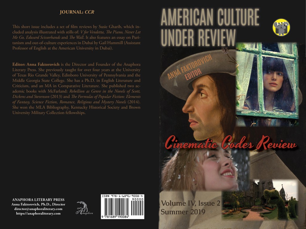 American Culture Under Review: Volume IV, Issue 2, Summer 2019: (46pp, 6X9”, $10: ISBN: 978-1-689190-08-4; 32 black and white illustrations; Nonfiction—Performing Arts—Film & Video—History & Criticism; Purchase on Amazon or Barnes & Noble): This short issue includes a set of film reviews by Susie Gharib, which included analysis illustrated with stills of: V for Vendetta, The Piano, Never Let Me Go, Edward Scissorhands and The Wall. It also features an essay on Puritanism and out-of-culture experiences in Dubai by Gail Hammill (Assistant Professor of English at the American University in Dubai).
