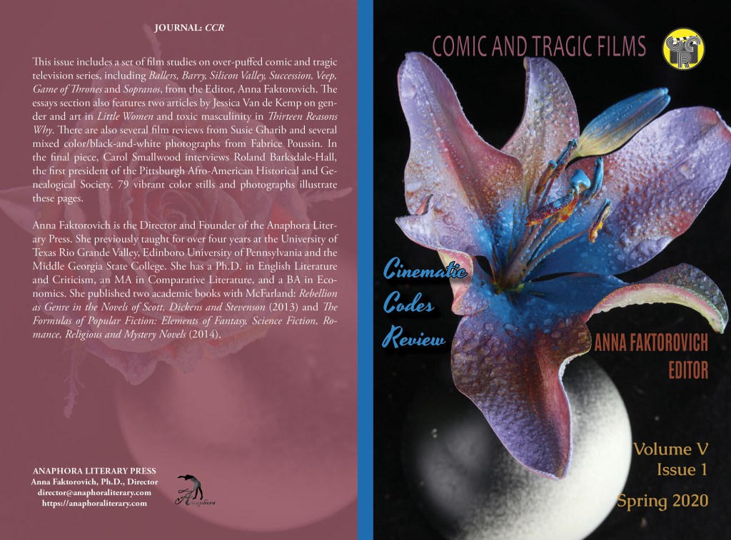 Comic and Tragic Films: Volume V, Issue 1, Spring 2020: (108pp, 6X9”, $25: ISBN: 979-8-65018-114-9; 79 color illustrations; Nonfiction—Performing Arts—Film & Video—History & Criticism; Purchase on Amazon or Barnes & Noble): This issue includes a set of film studies on over-puffed comic and tragic television series, including Ballers, Barry, Silicon Valley, Succession, Veep, Game of Thrones and Sopranos, from the Editor, Anna Faktorovich. The essays section also features two articles by Jessica Van de Kemp on gender and art in Little Women and toxic masculinity in Thirteen Reasons Why. There are also several film reviews from Susie Gharib and several mixed color/black-and-white photographs from Fabrice Poussin. In the final piece, Carol Smallwood interviews Roland Barksdale-Hall, the first president of the Pittsburgh Afro-American Historical and Genealogical Society. 79 vibrant color stills and photographs illustrate these pages.