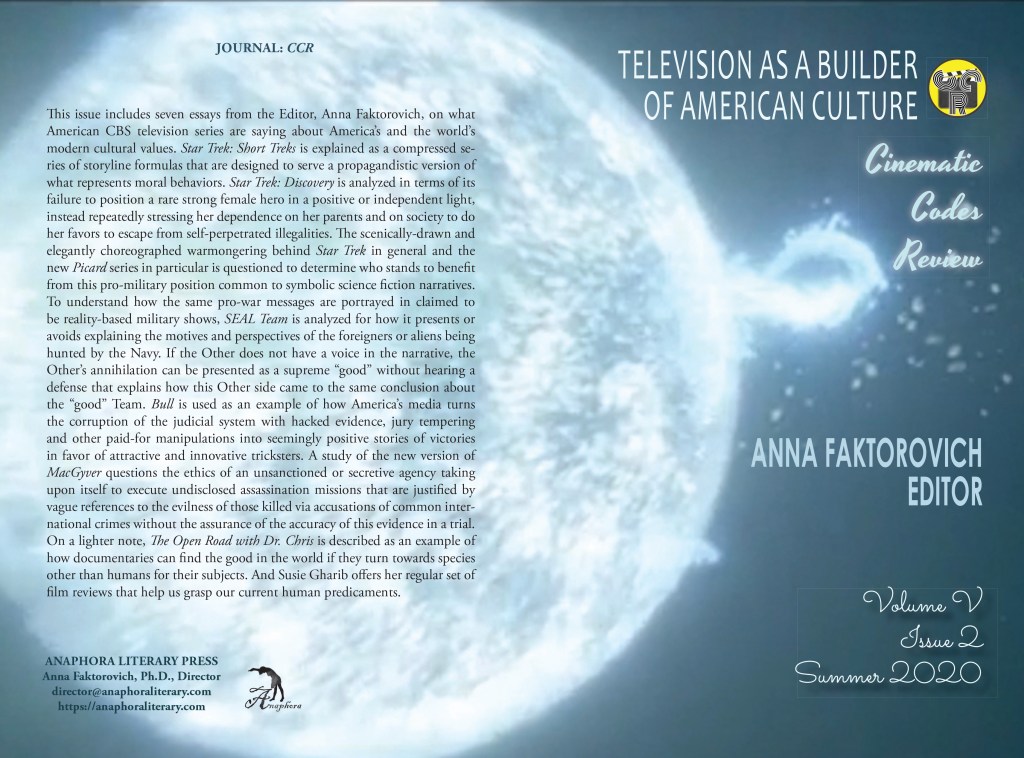 Television as a Builder of American Culture: Volume V, Issue 2, Summer 2020: (color: 100pp, 6X9”, $25: ISBN: 979-8-677671-00-5; 72 color stills; Nonfiction—Performing Arts—Film & Video—History & Criticism; Purchase on Amazon or Barnes & Noble): This issue includes seven essays from the Editor, Anna Faktorovich, on what American CBS television series are saying about America’s and the world’s modern cultural values. Star Trek: Short Treks is explained as a compressed series of storyline formulas that are designed to serve a propagandistic version of what represents moral behaviors. Star Trek: Discovery is analyzed in terms of its failure to position a rare strong female hero in a positive or independent light, instead repeatedly stressing her dependence on her parents and on society to do her favors to escape from self-perpetrated illegalities. The scenically-drawn and elegantly choreographed warmongering behind Star Trek in general and the new Picard series in particular is questioned to determine who stands to benefit from this pro-military position common to symbolic science fiction narratives. To understand how the same pro-war messages are portrayed in claimed to be reality-based military shows, SEAL Team is analyzed for how it presents or avoids explaining the motives and perspectives of the foreigners or aliens being hunted by the Navy. If the Other does not have a voice in the narrative, the Other’s annihilation can be presented as a supreme “good” without hearing a defense that explains how this Other side came to the same conclusion about the “good” Team. Bull is used as an example of how America’s media turns the corruption of the judicial system with hacked evidence, jury tempering and other paid-for manipulations into seemingly positive stories of victories in favor of attractive and innovative tricksters. A study of the new version of MacGyver questions the ethics of an unsanctioned or secretive agency taking upon itself to execute undisclosed assassination missions that are justified by vague references to the evilness of those killed via accusations of common international crimes without the assurance of the accuracy of this evidence in a trial. On a lighter note, The Open Road with Dr. Chris is described as an example of how documentaries can find the good in the world if they turn towards species other than humans for their subjects. And Susie Gharib offers her regular set of film reviews that help us grasp our current human predicaments.