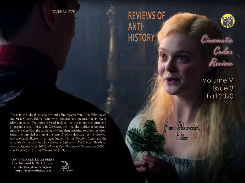 Reviews of Anti-History: Volume V, Issue 3, Fall 2020: (color: 66pp, 6X9”, $20: ISBN: 979-8-584475-83-3; 77 color stills; Nonfiction—Performing Arts—Film & Video—History & Criticism; Purchase on Amazon): This issue includes illustrated with stills film reviews from Anna Faktorovich and Susie Gharib. Editor Faktorovich criticizes and theorizes on six recent television series. The topics covered include: the pro-monarchic satire and propagandistic anti-history in The Great, the tribal death-drive of American culture in Outsiders, the suspiciously fraudulent statistical solutions in Numb3ers, the simplified version of the mega-Sherlock-detective-myth in Elementary, avoidable disasters in a rigged industry in the Deadliest Catch, and the romantic perspective on white-slavery and piracy in Black Sails. Gharib reviews A Monster Calls (2016), Mary Shelley: The Birth of Frankenstein (2003), Last Knights (2015), and Philadelphia (1993).