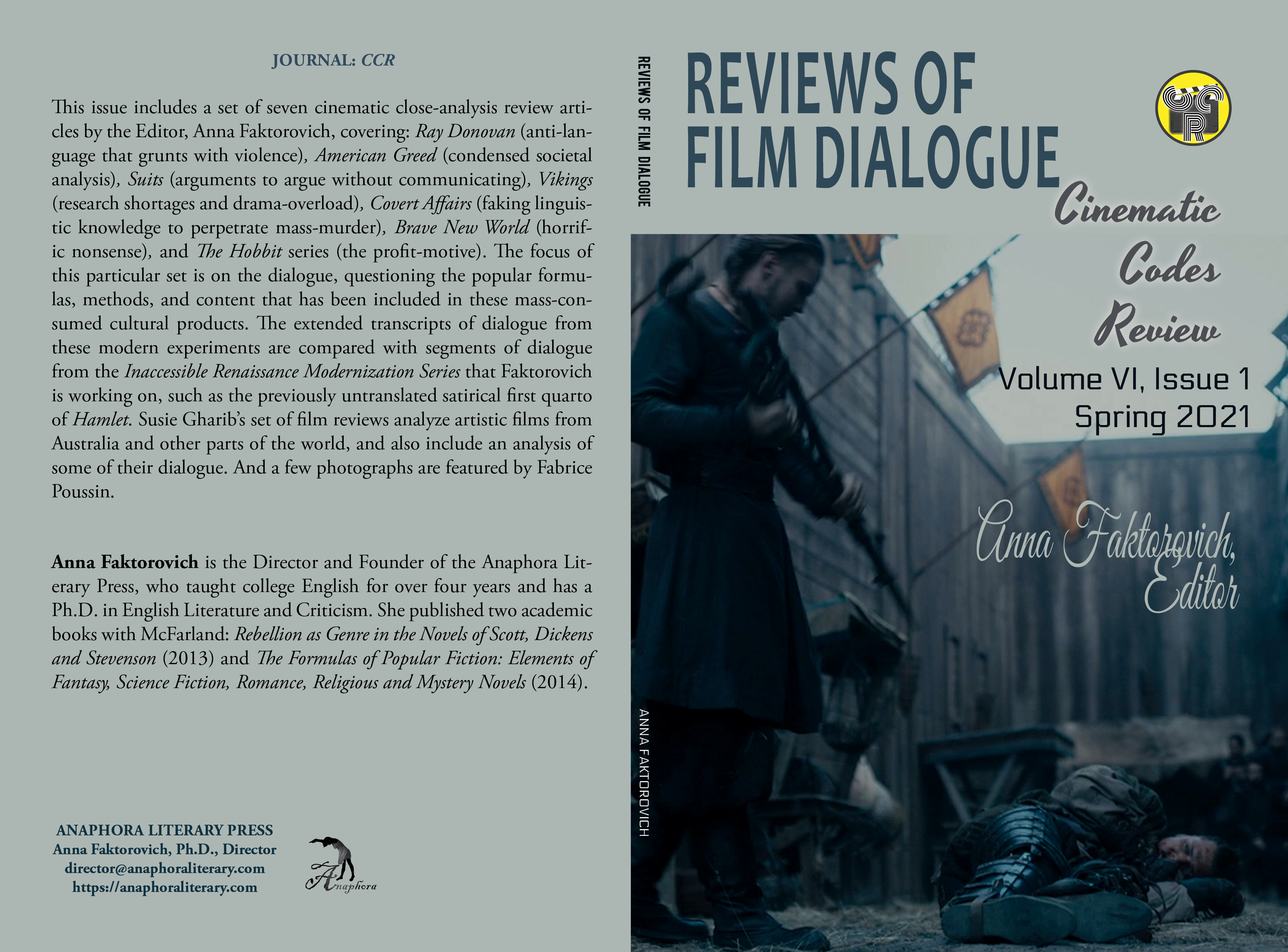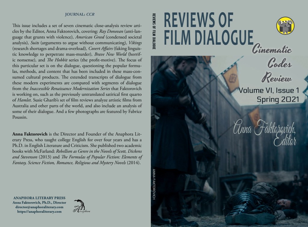 Reviews of Film Dialogue: Volume VI, Issue 1, Spring 2021: (color: $25, 98pp, 6X9″, ISBN: 979-8-511419-49-7; 89 still images, 6 photographs; Purchase on Amazon): This issue includes a set of seven cinematic close-analysis review articles by the Editor, Anna Faktorovich, covering: Ray Donovan (anti-language that grunts with violence), American Greed (condensed societal analysis), Suits (arguments to argue without communicating), Vikings (research shortages and drama-overload), Covert Affairs (faking linguistic knowledge to perpetrate mass-murder), Brave New World (horrific nonsense), and The Hobbit series (the profit-motive). The focus of this particular set is on the dialogue, questioning the popular formulas, methods, and content that has been included in these mass-consumed cultural products. The extended transcripts of dialogue from these modern experiments are compared with segments of dialogue from the Inaccessible Renaissance Modernization Series that Faktorovich is working on, such as the previously untranslated satirical first quarto of Hamlet. Susie Gharib’s set of film reviews analyze artistic films from Australia and other parts of the world, and also include an analysis of some of their dialogue. And a few photographs are featured by Fabrice Poussin.