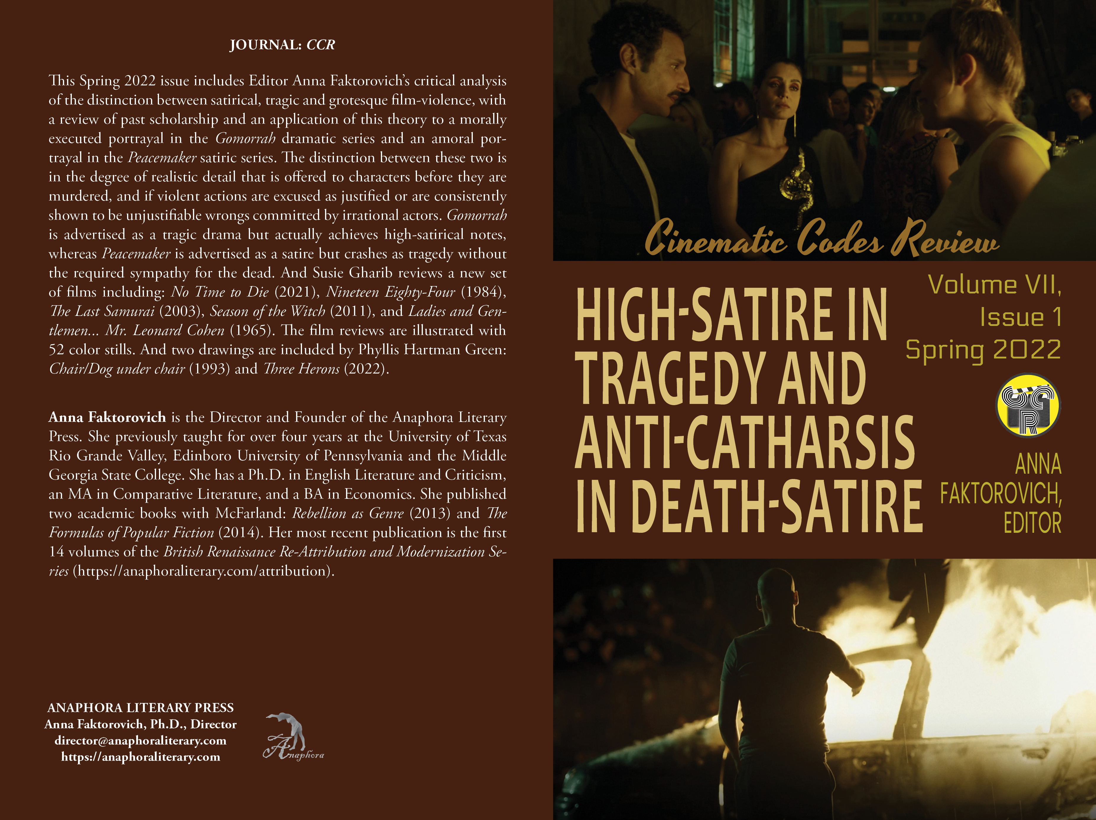 High-Satire in Tragedy and Anti-Catharsis in Death-Satire: Volume VII, Issue 1: Spring 2022: (Softcover Color: $20, 50pp, 6X9”, 52 color still illustrations: ISBN: 979-8-830537-37-7; Purchase on Amazon: Softcover): This Spring 2022 issue includes Editor Anna Faktorovich’s critical analysis of the distinction between satirical, tragic and grotesque film-violence, with a review of past scholarship and an application of this theory to a morally executed portrayal in the Gomorrah dramatic series and an amoral portrayal in the Peacemaker satiric series. The distinction between these two is in the degree of realistic detail that is offered to characters before they are murdered, and if violent actions are excused as justified or are consistently shown to be unjustifiable wrongs committed by irrational actors. Gomorrah is advertised as a tragic drama but actually achieves high-satirical notes, whereas Peacemaker is advertised as a satire but crashes as tragedy without the required sympathy for the dead. And Susie Gharib reviews a new set of films including: No Time to Die (2021), Nineteen Eighty-Four (1984), The Last Samurai (2003), Season of the Witch (2011), and Ladies and Gentlemen… Mr. Leonard Cohen (1965). The film reviews are illustrated with 52 color stills. And two drawings are included by Phyllis Hartman Green: Chair/Dog under chair (1993) and Three Herons (2022).