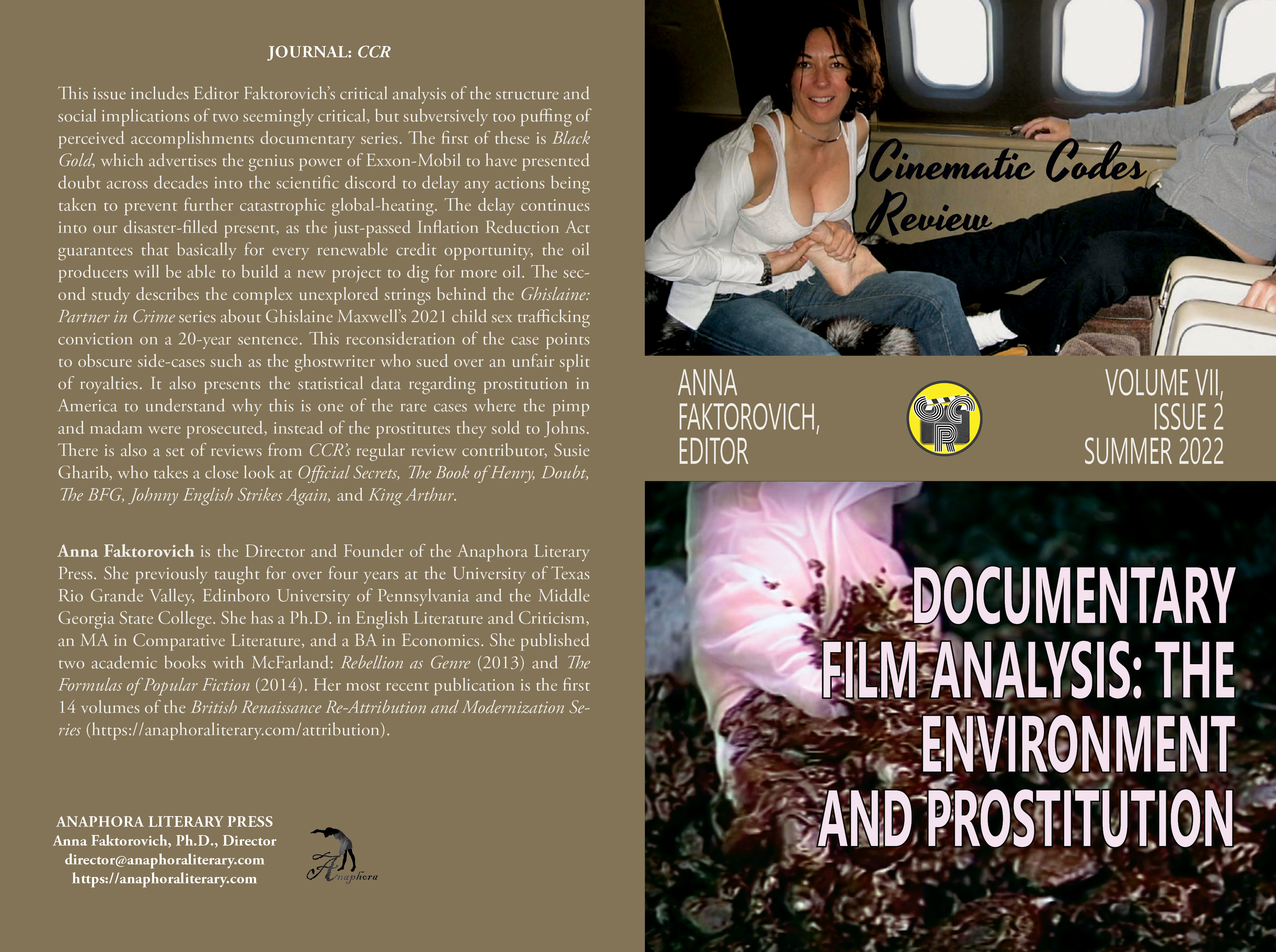 Documentary Film Analysis: The Environment and Prostitution: Volume VII, Issue 2: Summer 2022: (Softcover: $20, 58pp, 6X9”, color: 979-8-846015-79-1; Purchase on Amazon): This issue includes Editor Faktorovich’s critical analysis of the structure and social implications of two seemingly critical, but subversively too puffing of perceived accomplishments documentary series. The first of these is Black Gold, which advertises the genius power of Exxon-Mobil to have presented doubt across decades into the scientific discord to delay any actions being taken to prevent further catastrophic global-heating. The delay continues into our disaster-filled present, as the just-passed Inflation Reduction Act guarantees that basically for every renewable credit opportunity, the oil producers will be able to build a new project to dig for more oil. The second study describes the complex unexplored strings behind the Ghislaine: Partner in Crime series about Ghislaine Maxwell’s 2021 child sex trafficking conviction on a 20-year sentence. This reconsideration of the case points to obscure side-cases such as the ghostwriter who sued over an unfair split of royalties. It also presents the statistical data regarding prostitution in America to understand why this is one of the rare cases where the pimp and madam were prosecuted, instead of the prostitutes they sold to Johns. There is also a set of reviews from CCR’s regular review contributor, Susie Gharib, who takes a close look at Official Secrets, The Book of Henry, Doubt, The BFG, Johnny English Strikes Again, and King Arthur.
