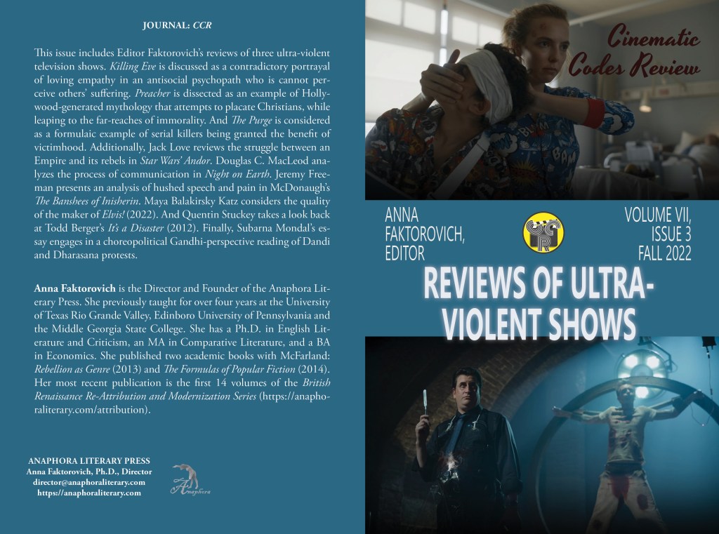 Reviews of Ultra-Violent Shows: Volume VII, Issue 3: Fall 2022: (Softcover: $20: color: 88pp, 6X9”, 43 still photographs: 979-8-371139-91-7; Hardcover: $27: 979-8-371142-48-1; Purchase on Amazon): This issue includes Editor Faktorovich’s reviews of three ultra-violent television shows. Killing Eve is discussed as a contradictory portrayal of loving empathy in an antisocial psychopath who is cannot perceive others’ suffering. Preacher is dissected as an example of Hollywood-generated mythology that attempts to placate Christians, while leaping to the far-reaches of immorality. And The Purge is considered as a formulaic example of serial killers being granted the benefit of victimhood. Additionally, Jack Love reviews the struggle between an Empire and its rebels in Star Wars’ Andor. Douglas C. MacLeod analyzes the process of communication in Night on Earth.Jeremy Freeman presents an analysis of hushed speech and pain in McDonaugh’s The Banshees of Inisherin. Maya Balakirsky Katz considers the quality of the maker of Elvis! (2022). And Quentin Stuckey takes a look back at Todd Berger’s It’s a Disaster (2012). Finally, Subarna Mondal’s essay engages in a choreopolitical Gandhi-perspective reading of Dandi and Dharasana protests.