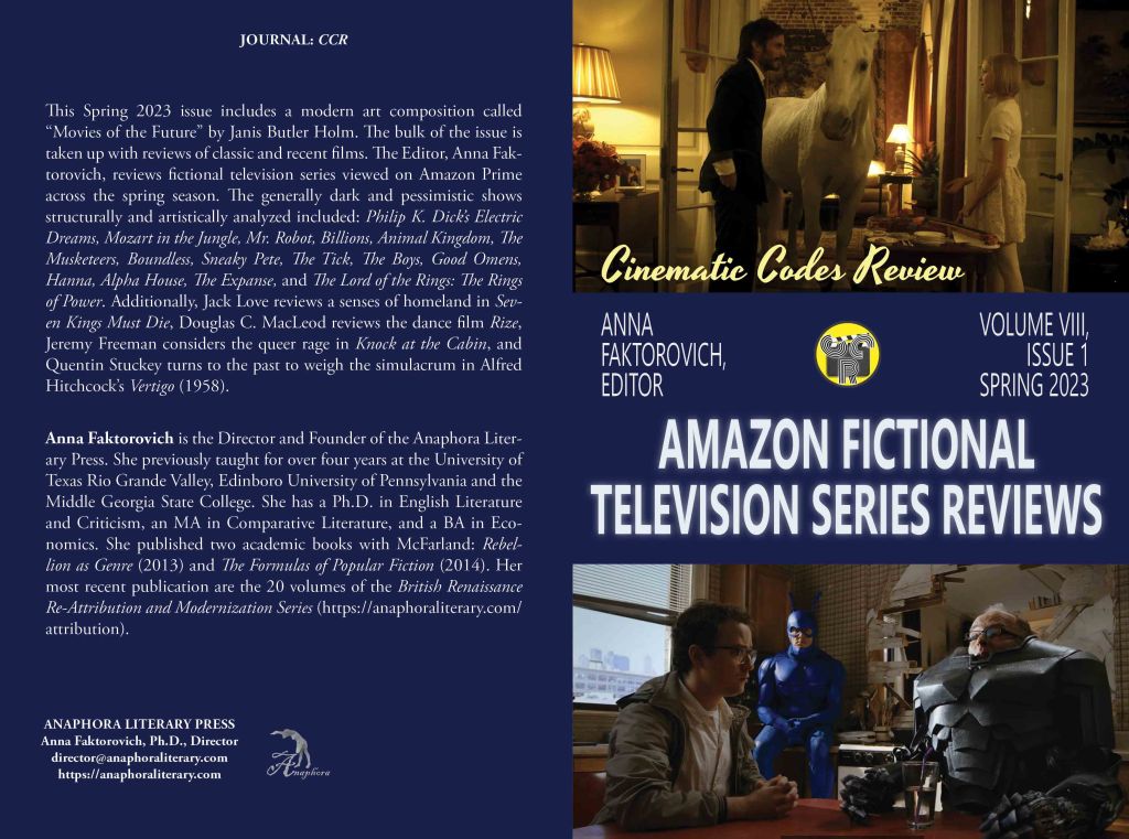 Amazon Fictional Television Series Reviews: Volume VIII, Issue 1: Spring 2023: (Softcover: $20: color: 78pp, 6X9”, 30 still photographs: ISBN: 979-8-396622-18-0; Hardcover: $27: ISBN: 979-8-396622-53-1; Purchase on Amazon): This Spring 2023 issue includes a modern art composition called “Movies of the Future” by Janis Butler Holm. The bulk of the issue is taken up with reviews of classic and recent films. The Editor, Anna Faktorovich, reviews fictional television series viewed on Amazon Prime across the spring season. The generally dark and pessimistic shows structurally and artistically analyzed included: Philip K. Dick’s Electric Dreams, Mozart in the Jungle, Mr. Robot, Billions, Animal Kingdom, The Musketeers, Boundless, Sneaky Pete, The Tick, The Boys, Good Omens, Hanna, Alpha House, The Expanse, and The Lord of the Rings: The Rings of Power. Additionally, Jack Love reviews a senses of homeland in Seven Kings Must Die, Douglas C. MacLeod reviews the dance film Rize, Jeremy Freeman considers the queer rage in Knock at the Cabin, and Quentin Stuckey turns to the past to weigh the simulacrum in Alfred Hitchcock’s Vertigo (1958).