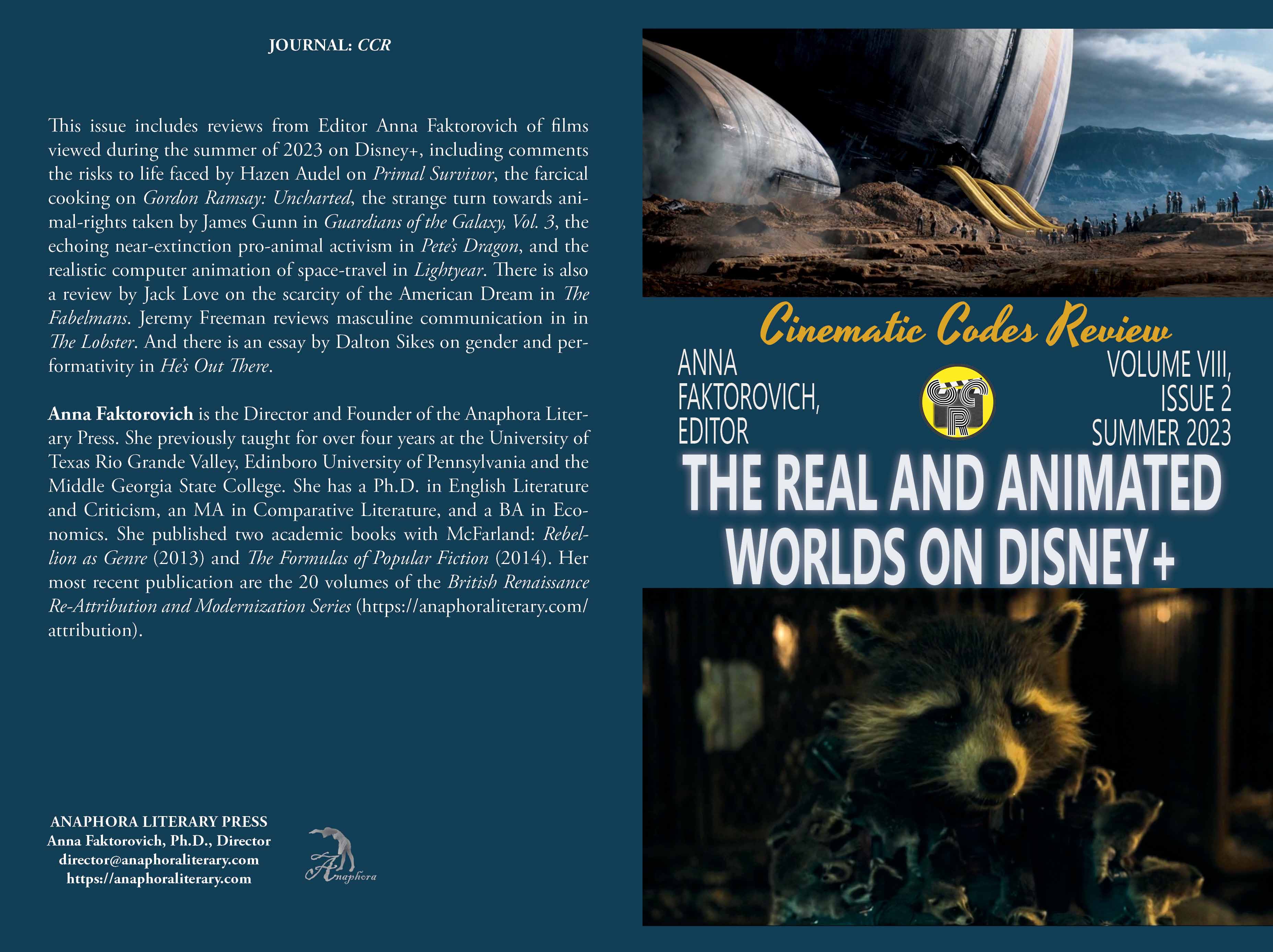 The Real and Animated Worlds on Disney+: Volume VIII, Issue 2: Summer 2023: (Softcover: $20: premium color: 50pp, 6X9”, 9 still photographs: ISBN: 979-8-857789-64-3; Purchase on Amazon): This issue includes reviews from Editor Anna Faktorovich of films viewed during the summer of 2023 on Disney+, including comments the risks to life faced by Hazen Audel on Primal Survivor, the farcical cooking on Gordon Ramsay: Uncharted, the strange turn towards animal-rights taken by James Gunn in Guardians of the Galaxy, Vol. 3, the echoing near-extinction pro-animal activism in Pete’s Dragon, and the realistic computer animation of space-travel in Lightyear. There is also a review by Jack Love on the scarcity of the American Dream in The Fabelmans. Jeremy Freeman reviews masculine communication in in The Lobster. And there is an essay by Dalton Sikes on gender and performativity in He’s Out There.