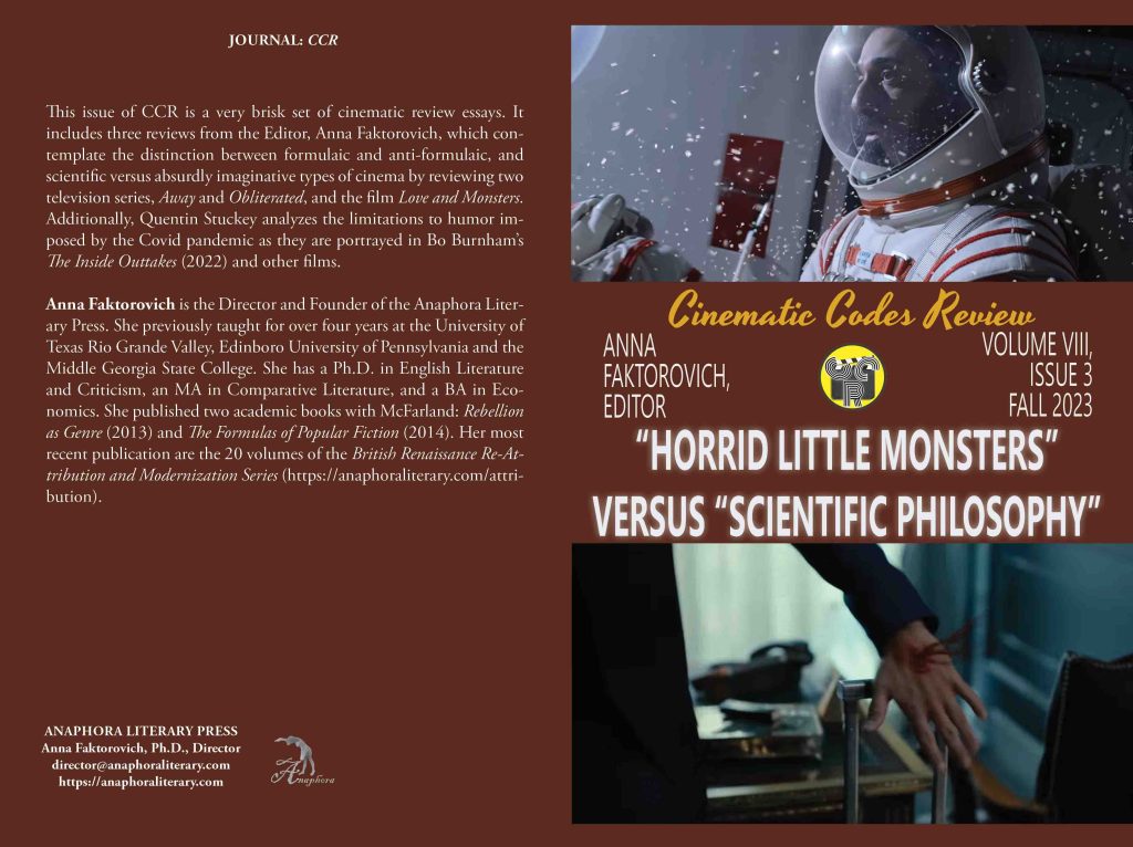 “Horrid Little Monsters” versus “Scientific Philosophy”: Volume VIII, Issue 3: Fall 2023: (Softcover: $20: premium color: 44pp, 6X9”, 19 still photographs: ISBN: 979-8-873571-90-1; Books—Humor & Entertainment—Television—Guides & Reviews; Purchase on Amazon): This issue of CCR is a very brisk set of cinematic review essays. It includes three reviews from the Editor, Anna Faktorovich, which contemplate the distinction between formulaic and anti-formulaic, and scientific versus absurdly imaginative types of cinema by reviewing two television series, Away and Obliterated, and the film Love and Monsters. Additionally, Quentin Stuckey analyzes the limitations to humor imposed by the Covid pandemic as they are portrayed in Bo Burnham’s The Inside Outtakes (2022) and other films.