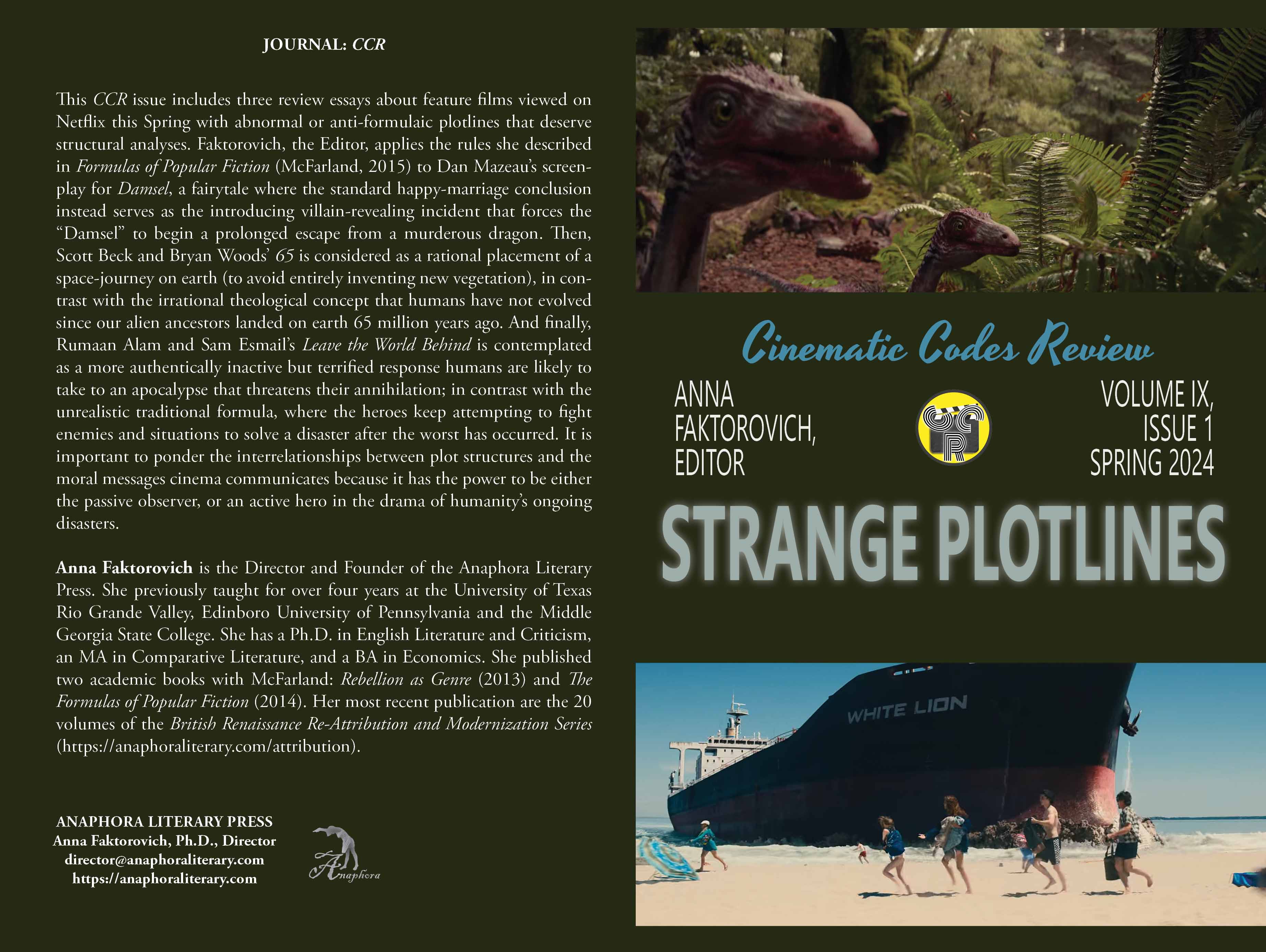 Strange Plotlines: Spring 2024: Volume IX, Issue 1: (Softcover: $20: premium color: 24pp, 6X9”, 16 still photographs: ISBN: 979-8-325582-74-5; Books—Humor & Entertainment—Television—Guides & Reviews; Purchase on Amazon): This CCR issue includes three review essays about feature films viewed on Netflix this Spring with abnormal or anti-formulaic plotlines that deserve structural analyses. Faktorovich, the Editor, applies the rules she described in Formulas of Popular Fiction (McFarland, 2015) to Dan Mazeau’s screenplay for Damsel, a fairytale where the standard happy-marriage conclusion instead serves as the introducing villain-revealing incident that forces the “Damsel” to begin a prolonged escape from a murderous dragon. Then, Scott Beck and Bryan Woods’ 65 is considered as a rational placement of a space-journey on earth (to avoid entirely inventing new vegetation), in contrast with the irrational theological concept that humans have not evolved since our alien ancestors landed on earth 65 million years ago. And finally, Rumaan Alam and Sam Esmail’s Leave the World Behind is contemplated as a more authentically inactive but terrified response humans are likely to take to an apocalypse that threatens their annihilation; in contrast with the unrealistic traditional formula, where the heroes keep attempting to fight enemies and situations to solve a disaster after the worst has occurred. It is important to ponder the interrelationships between plot structures and the moral messages cinema communicates because it has the power to be either the passive observer, or an active hero in the drama of humanity’s ongoing disasters.