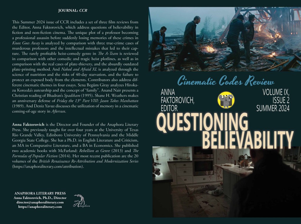 Questioning Believability: Summer 2024: Volume IX, Issue 2: (Softcover: standard color: ISBN: 979-8-335722-27-8: $20, 72pp, 6X9”; Humor & Entertainment—Movies—Guides & Reviews; Purchase on Amazon): This issue includes a set of three film reviews from the Editor, Anna Faktorovich, which address questions of believability in fiction and non-fiction cinema. The unique plot of a professor becoming a professional assassin before suddenly losing memories of these crimes in Knox Goes Away is analyzed by comparison with three true-crime cases of murderous professors and the intellectual mistakes that led to their capture. The rarely profitable heist-comedy genre in The A-Team is reviewed in comparison with other comedic and tragic heist plotlines, as well as in comparison with the real cases of plate-thievery, and the absurdly outdated plate-printing method. And Naked and Afraid XL is analyzed through the science of nutrition and the risks of 40-day starvation, and the failure to protect an exposed body from the elements. Contributors also address different cinematic themes in four essays. Sena Begüm Giray analyzes Hirokazu Koreeda’s auteurship and the concept of “family”. Anand Nair presents a Christian reading of Bhadran’s Spadikam (1995). Shane H. Weathers makes an anniversary defense of Friday the 13th Part VIII: Jason Takes Manhattan (1989). And Deniz Yavuz discusses the utilization of memory in a cinematic coming-of-age story in Aftersun.