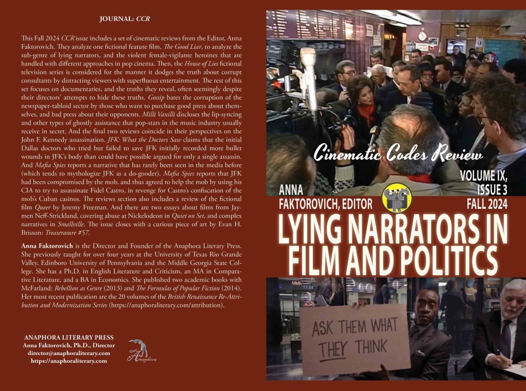 Lying Narrators in Film and Politics: Fall 2024: Volume IX, Issue 3: (Softcover: standard color: ISBN: 979-8-305192-52-0: $20, 72pp, 6X9”; Humor & Entertainment—Movies—Guides & Reviews; Purchase on Amazon): This Fall 2024 CCR issue includes a set of cinematic reviews from the Editor, Anna Faktorovich. They analyze one fictional feature film, The Good Liar, to analyze the sub-genre of lying narrators, and the violent female-vigilante heroines that are handled with different approaches in pop cinema. Then, the House of Lies fictional television series is considered for the manner it dodges the truth about corrupt consultants by distracting viewers with superfluous entertainment. The rest of this set focuses on documentaries, and the truths they reveal, often seemingly despite their directors’ attempts to hide these truths. Gossip bares the corruption of the newspaper-tabloid sector by those who want to purchase good press about themselves, and bad press about their opponents. Milli Vanilli discloses the lip-syncing and other types of ghostly assistance that pop-stars in the music industry usually receive in secret. And the final two reviews coincide in their perspectives on the John F. Kennedy assassination. JFK: What the Doctors Saw claims that the initial Dallas doctors who tried but failed to save JFK initially recorded more bullet wounds in JFK’s body than could have possible argued for only a single assassin. And Mafia Spies reports a narrative that has rarely been seen in the media before (which tends to mythologize JFK as a do-gooder). Mafia Spies reports that JFK had been compromised by the mob, and thus agreed to help the mob by using his CIA to try to assassinate Fidel Castro, in revenge for Castro’s confiscation of the mob’s Cuban casinos. The reviews section also includes a review of the fictional film Queer by Jeremy Freeman. And there are two essays about films from Jaymen Neff-Strickland, covering abuse at Nickelodeon in Quiet on Set, and complex narratives in Smallville. The issue closes with a curious piece of art by Evan H. Brisson: Treaserasure #57.