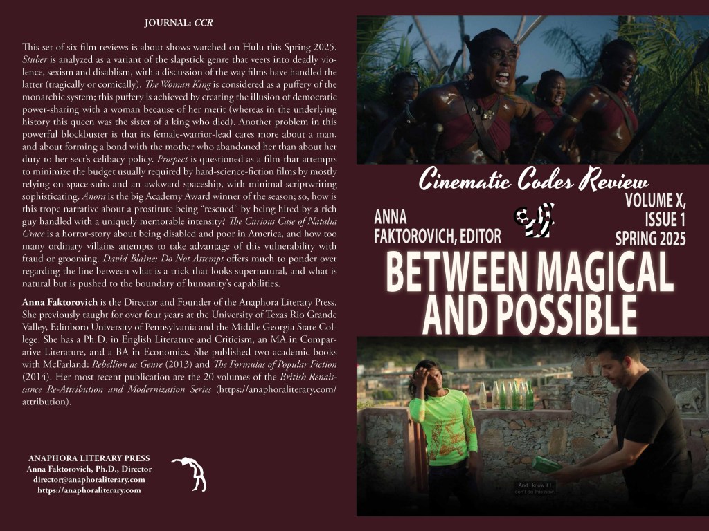 Between Magical and Possible: Spring 2025: Volume X, Issue 1: (Paperback: $20: premium color: ISBN: 979-8-284791-55-4, 6X9”, 30pp, 6 still photographs; Purchase on Amazon): This set of six film reviews is about shows watched on Hulu this Spring 2025. Stuber is analyzed as a variant of the slapstick genre that veers into deadly violence, sexism and disablism, with a discussion of the way films have handled the latter (tragically or comically). The Woman King is considered as a puffery of the monarchic system; this puffery is achieved by creating the illusion of democratic power-sharing with a woman because of her merit (whereas in the underlying history this queen was the sister of a king who died). Another problem in this powerful blockbuster is that its female-warrior-lead cares more about a man, and about forming a bond with the mother who abandoned her than about her duty to her sect’s celibacy policy. Prospect is questioned as a film that attempts to minimize the budget usually required by hard-science-fiction films by mostly relying on space-suits and an awkward spaceship, with minimal scriptwriting sophisticating. Anora is the big Academy Award winner of the season; so, how is this trope narrative about a prostitute being “rescued” by being hired by a rich guy handled with a uniquely memorable intensity? The Curious Case of Natalia Grace is a horror-story about being disabled and poor in America, and how too many ordinary villains attempts to take advantage of this vulnerability with fraud or grooming. David Blaine: Do Not Attempt offers much to ponder over regarding the line between what is a trick that looks supernatural, and what is natural but is pushed to the boundary of humanity’s capabilities.