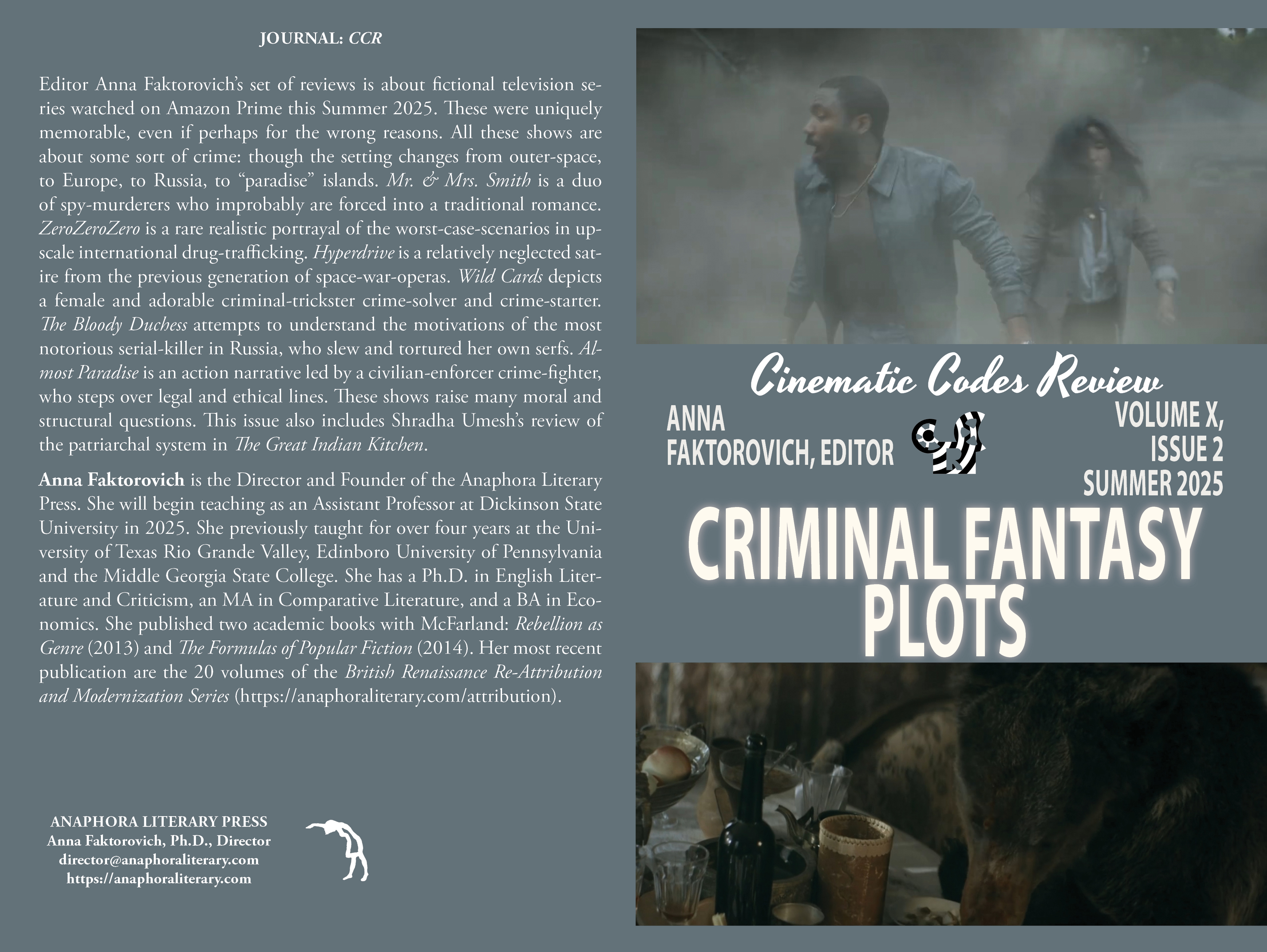 Criminal Fantasy Plots: Summer 2025: Volume X, Issue 2: (Paperback: $20: premium color: ISBN: 979-8-297056-87-9, 6X9”, 24pp, 6 still photographs; Purchase on Amazon): Editor Anna Faktorovich’s set of reviews is about fictional television series watched on Amazon Prime this Summer 2025. These were uniquely memorable, even if perhaps for the wrong reasons. All these shows are about some sort of crime: though the setting changes from outer-space, to Europe, to Russia, to “paradise” islands. Mr. & Mrs. Smith is a duo of spy-murderers who improbably are forced into a traditional romance. ZeroZeroZero is a rare realistic portrayal of the worst-case-scenarios in upscale international drug-trafficking. Hyperdrive is a relatively neglected satire from the previous generation of space-war-operas. Wild Cards depicts a female and adorable criminal-trickster crime-solver and crime-starter. The Bloody Duchess attempts to understand the motivations of the most notorious serial-killer in Russia, who slew and tortured her own serfs. Almost Paradise is an action narrative led by a civilian-enforcer crime-fighter, who steps over legal and ethical lines. These shows raise many moral and structural questions. This issue also includes Shradha Umesh’s review of the patriarchal system in The Great Indian Kitchen.