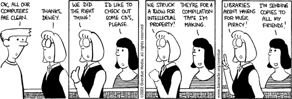 Faktorovich: In one of your earlier strips from Wednesday, June 19, 2002, you discuss intellectual property. A librarian is attempting to combat piracy at the library, while a patron is attempting to take CDs out to copy and send to her friends. Have you done many strips on intellectual property over the years? Do you think contradictions and ironies such as the one depicted here are at the backbone of good comic humor? What are the elements needed to make a comic humorous? For example, does slapstick work? Is it more important to say something meaningful with a comic vs. getting a laugh?
