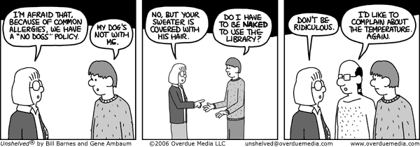Faktorovich: According to Wikipedia, you initially called the cartoon, Overdue, and within a year of its release you ran into “trademark issues” and had to rename it via a contest with your readers. Can you describe this incident in a bit more detail? Did you deliberately call the new cartoon with a name that wasn’t in the dictionary, or did you do extensive research to find a single word that was no already trademarked? What do you think about the concept of trademarking a common dictionary word like “overdue”? Are creators that sue others over trademark name disputes like this one being too litigious or have you had experiences where you appreciated having a similar protection for your Unshelved brand? For example, if I created a cartoon about the library (as I confess I’m tempted to do) and called it, Non-shelved, are you likely to file charges?