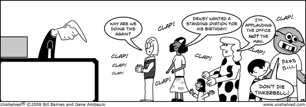 Ambaum: To all aspiring writers, I say find someone who can draw and who not only handles the technical website stuff but who also enjoys it. It’s been wonderful to work with Bill in this respect, he’s amazing. Without him, Unshelved would not only not be hosted on GeoCities, it would look crap (see the strips from his birthday, January 13th, over the years).