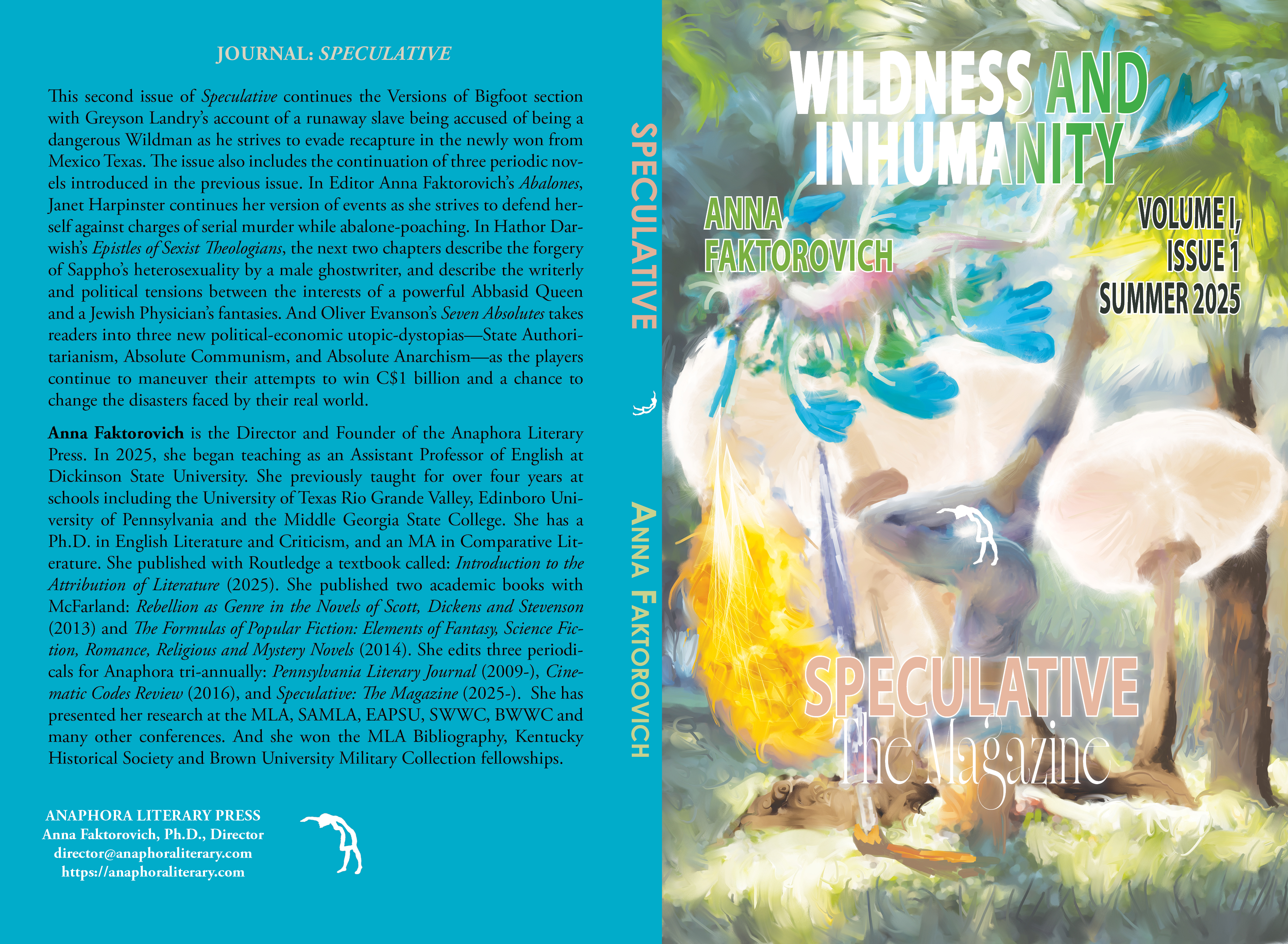 Wildness and Inhumanity: Volume I, Issue 2, Fall 2025: (Softcover: ISBN: 979-8-241286-37-6: $20: 148pp, 6X9”; Hardcover: ISBN: 979-8-241286-51-2: $25; Purchase on Amazon):This second issue of Speculative continues the Versions of Bigfoot section with Greyson Landry’s account of a runaway slave being accused of being a dangerous Wildman as he strives to evade recapture in the newly won from Mexico Texas. The issue also includes the continuation of three periodic novels introduced in the previous issue. In Editor Anna Faktorovich’s Abalones, Janet Harpinster continues her version of events as she strives to defend herself against charges of serial murder while abalone-poaching. In Hathor Darwish’s Epistles of Sexist Theologians, the next two chapters describe the forgery of Sappho’s heterosexuality by a male ghostwriter, and describe the writerly and political tensions between the interests of a powerful Abbasid Queen and a Jewish Physician’s fantasies. And Oliver Evanson’s Seven Absolutes takes readers into three new political-economic utopic-dystopias—State Authoritarianism, Absolute Communism, and Absolute Anarchism—as the players continue to maneuver their attempts to win C$1 billion and a chance to change the disasters faced by their real world.